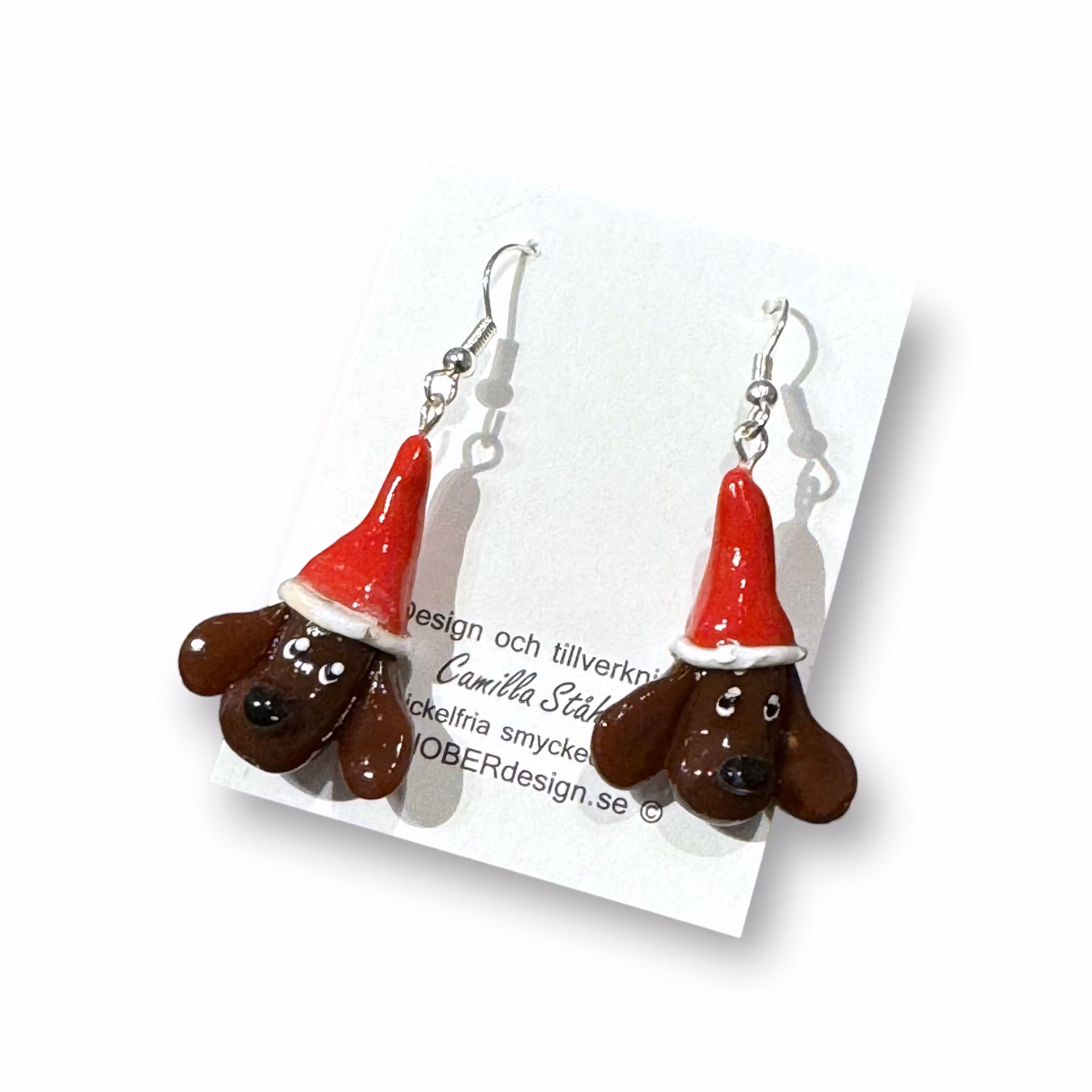 Små söta örhängen med hundar i tomteluva. Dessa gör jag för hand så de blir lite olika i utseende och storlek.