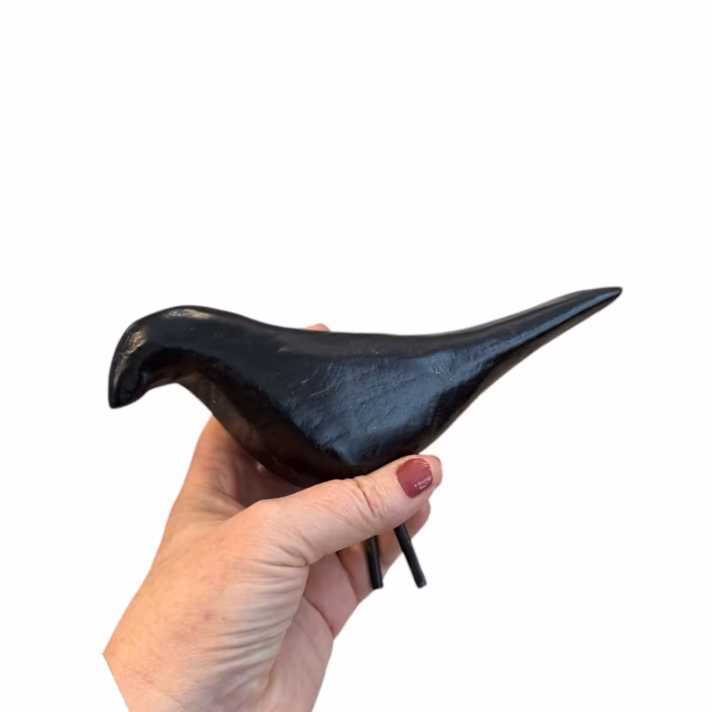 Fågeln har en avskalad design i svart och är handgjord, vilket gör varje fågel unik.Observera att torksprickor är en del av det naturliga utseendet på trädekora