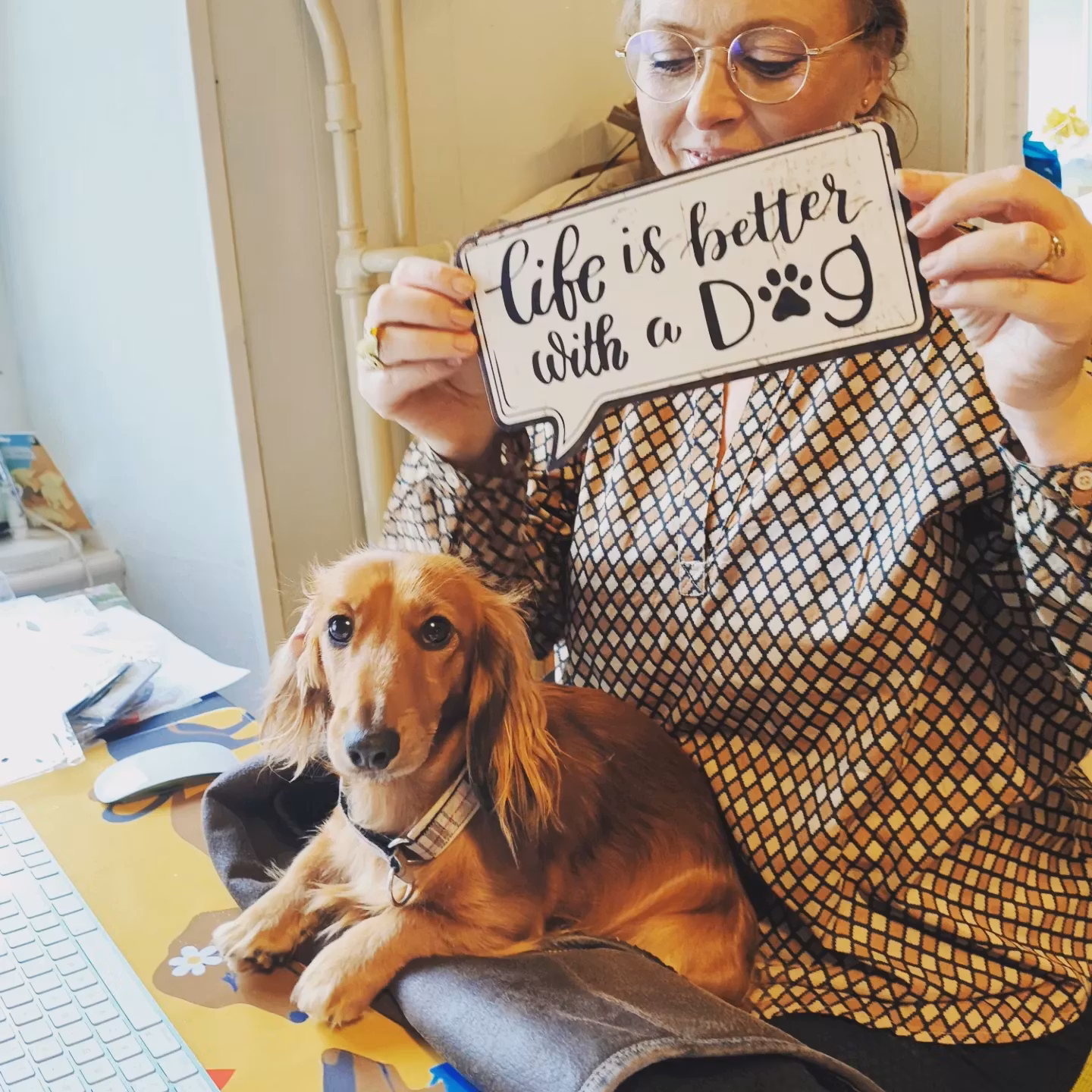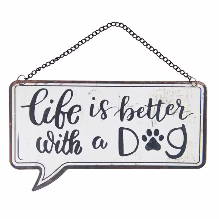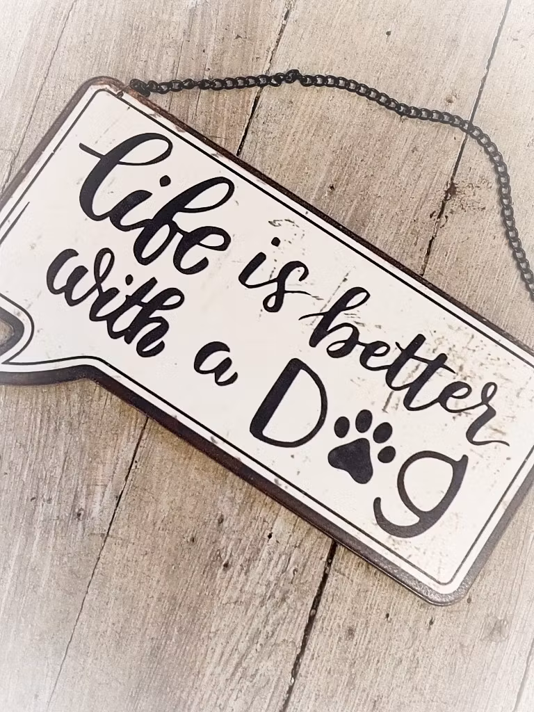 En plåtskylt med texten " Life is better whit a dog"Stl: 24 x 13 cmPris: 75:-