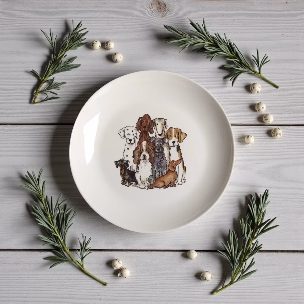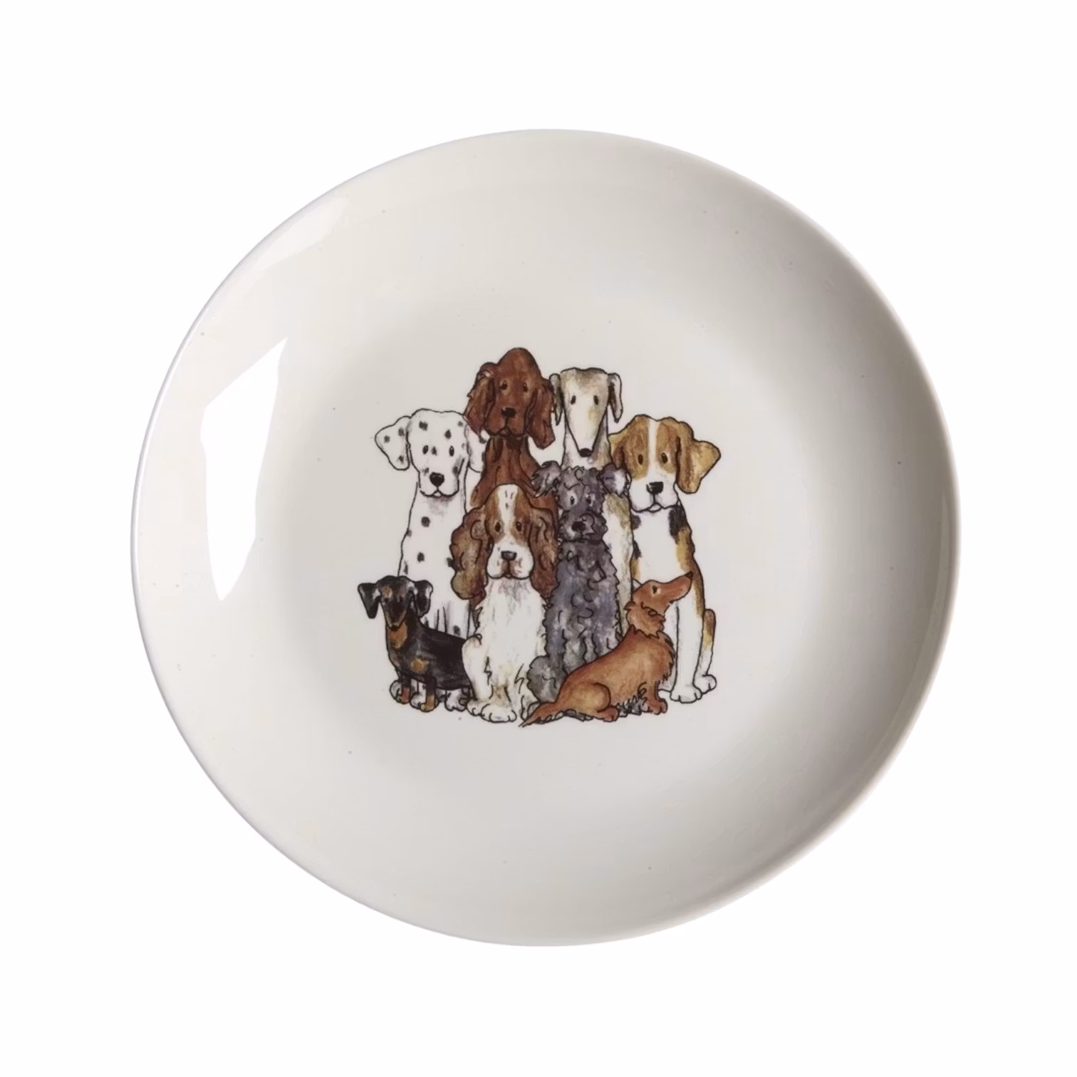 Rund porslinsassiett med hundmotiv – idealisk till frukost, fika eller små serveringar.