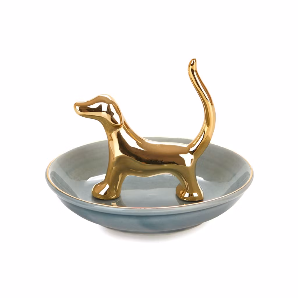 Skål i grågrön ton med hund i guld där svansen är perfekt att hänga sina ringar på. Tillverkad i porslin.