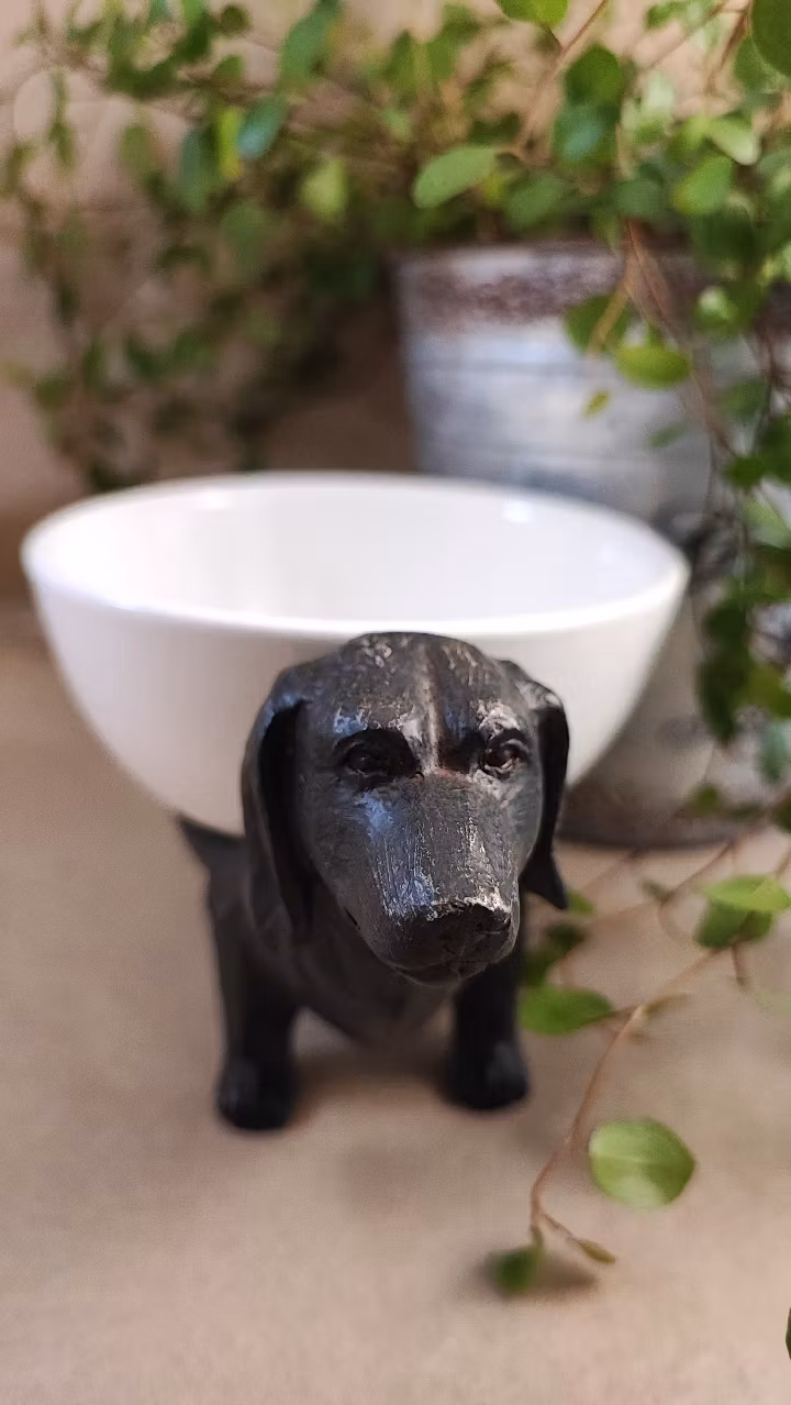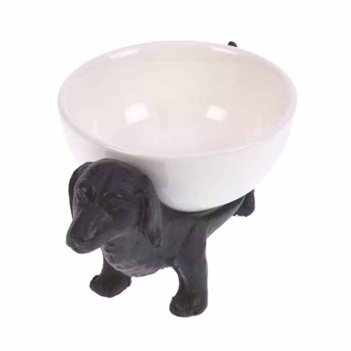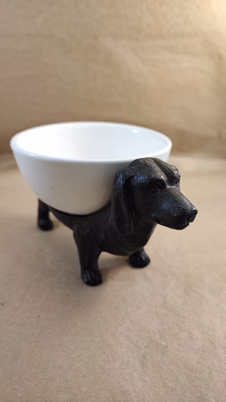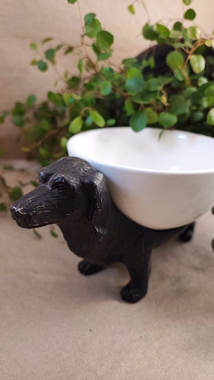 För Hundgodis & Sötsaker. En perfekt detalj för alla taxälskare! Den här dekorativa taxen bär en porslinsskål på ryggen, idealisk för hundgodis.