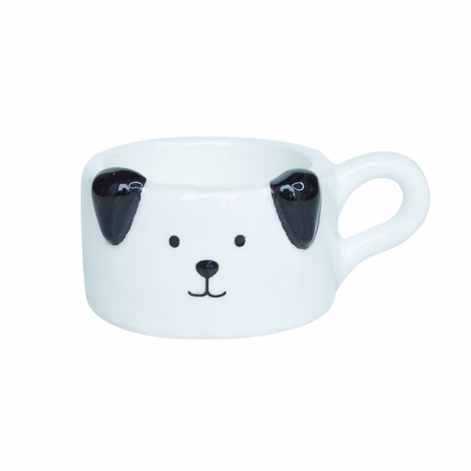 Charmig liten ljusstake i form av ett hundansikte, vit med svarta öron och nätt handtag. Passar för värmeljus eller som skål för fingsalt på matbordet.