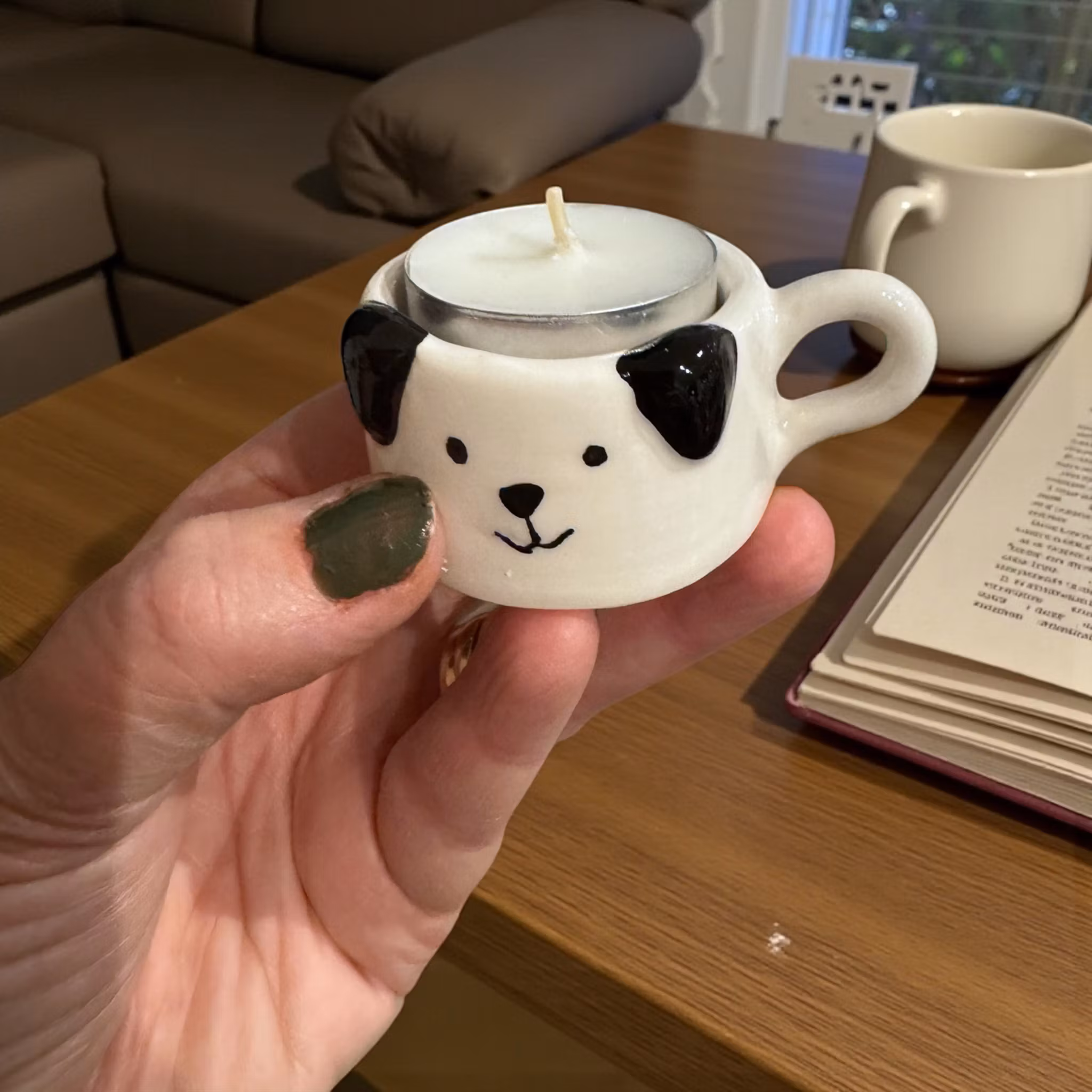 Den här lilla ljusstaken är både dekorativ och mångsidig. Utformad som ett hundansikte i vitt med svarta öron och ett nätt handtag, blir den en lekfull detalj som passar lika bra i vardagsrummet som på matbordet. Ljusstaken har plats för ett värmeljus och sprider ett mjukt sken som skapar stämning, men den fungerar också utmärkt som en liten skål för fingsalt eller andra små tillbehör vid dukningen. Kombinationen av charmig design och praktisk funktion gör den till en unik prydnad som snabbt blir en favorit – en liten detalj som sprider både glädje och värme i hemmet.