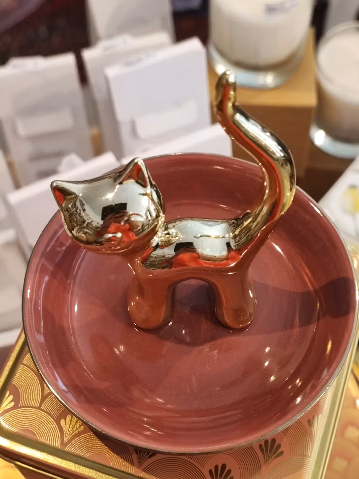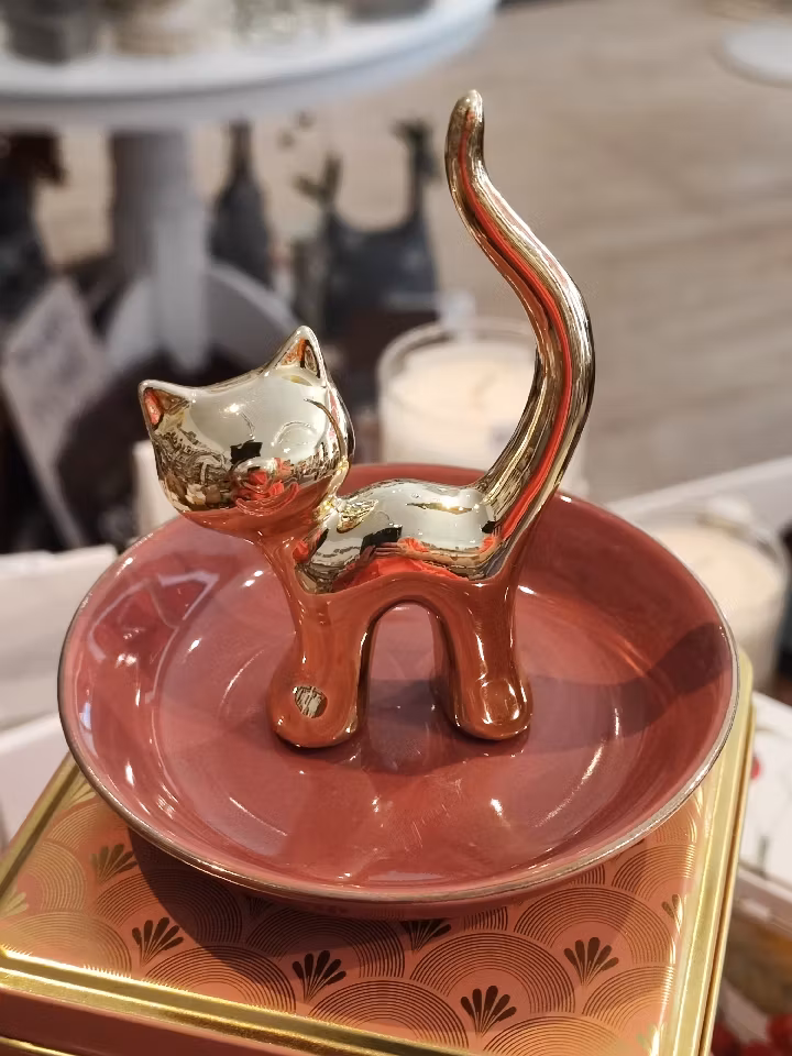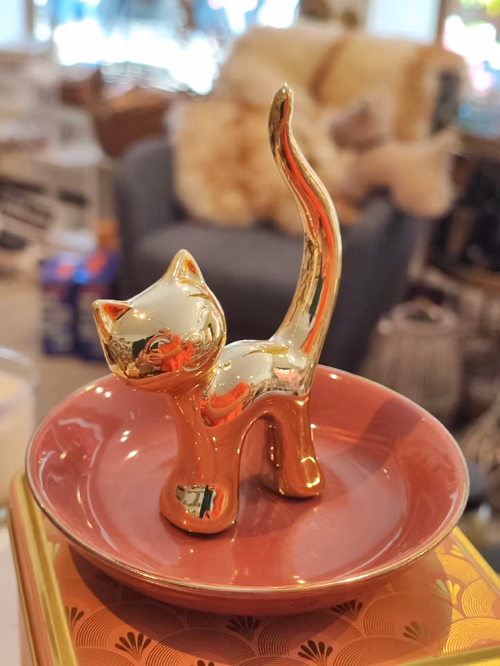 Skål i  gammelrosa ton med katt i guld där svansen är perfekt att hänga sina ringar på. Tillverkad i porslin.Stl: 8 x 10 x 10 cmPris: 149:-