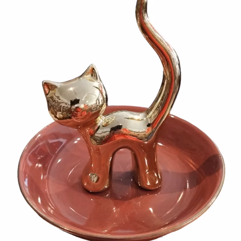 Skål i  gammelrosa ton med katt i guld där svansen är perfekt att hänga sina ringar på. Tillverkad i porslin.