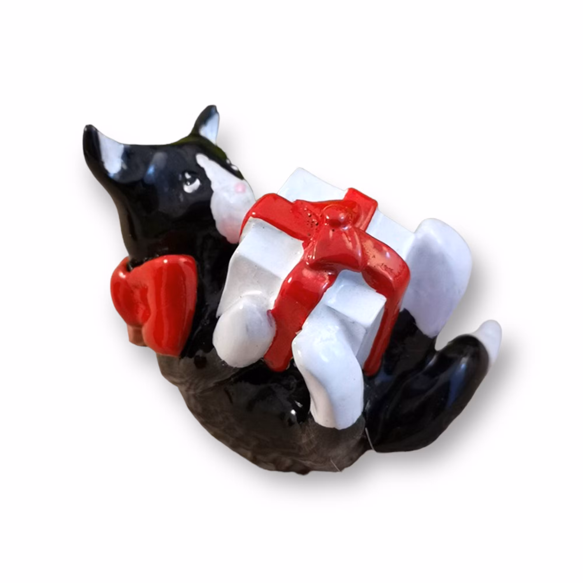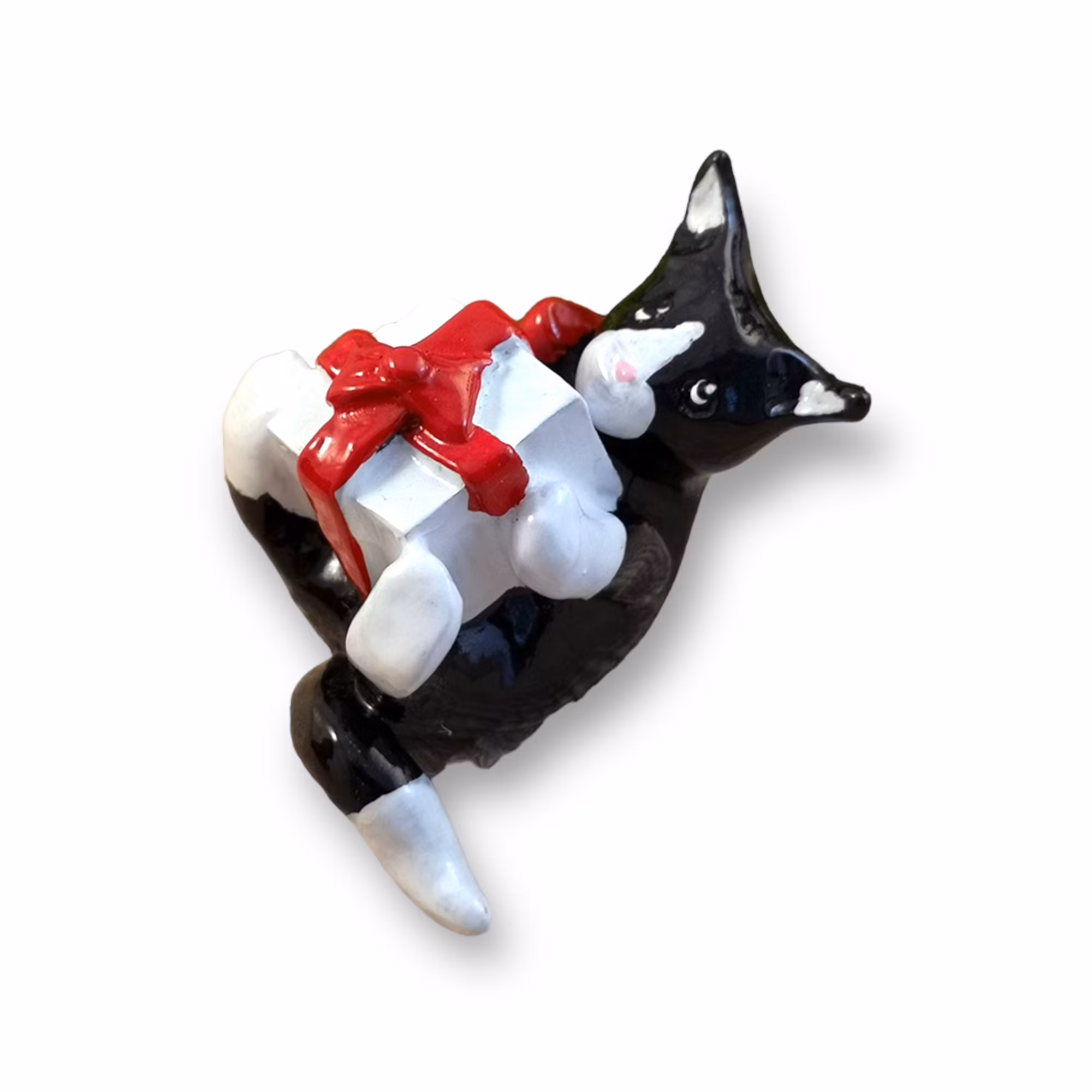 Den här söta lilla katten är redo att sprida julglädje! Med sin svartvita päls och lekfulla pose ligger den på rygg och håller ett vitt paket med röda snören tätt intill sig, som om den just fått sin allra bästa julklapp. Figuren är ca 6 cm och skapad i min egen design, med fokus på detaljer och personlighet som gör den till en unik dekoration. Perfekt att placera i julgruppen, på hyllan eller som en liten överraskning i adventskalendern – den blir snabbt en favorit som lockar både leenden och julstämning.