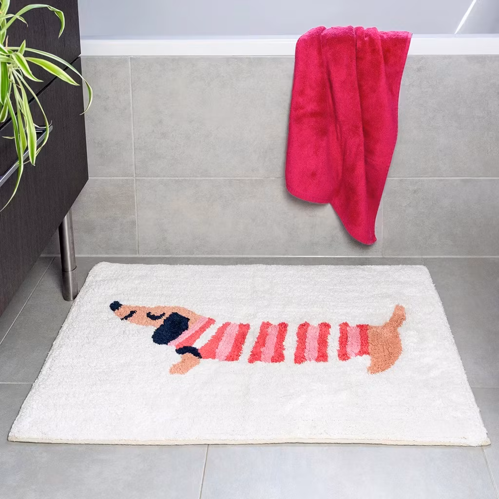 Mjuk badrumsmatta med taxmotiv, charmig komfort. Ge ditt badrum en lekfull touch med denna mjuka och gosiga badrumsmatta!