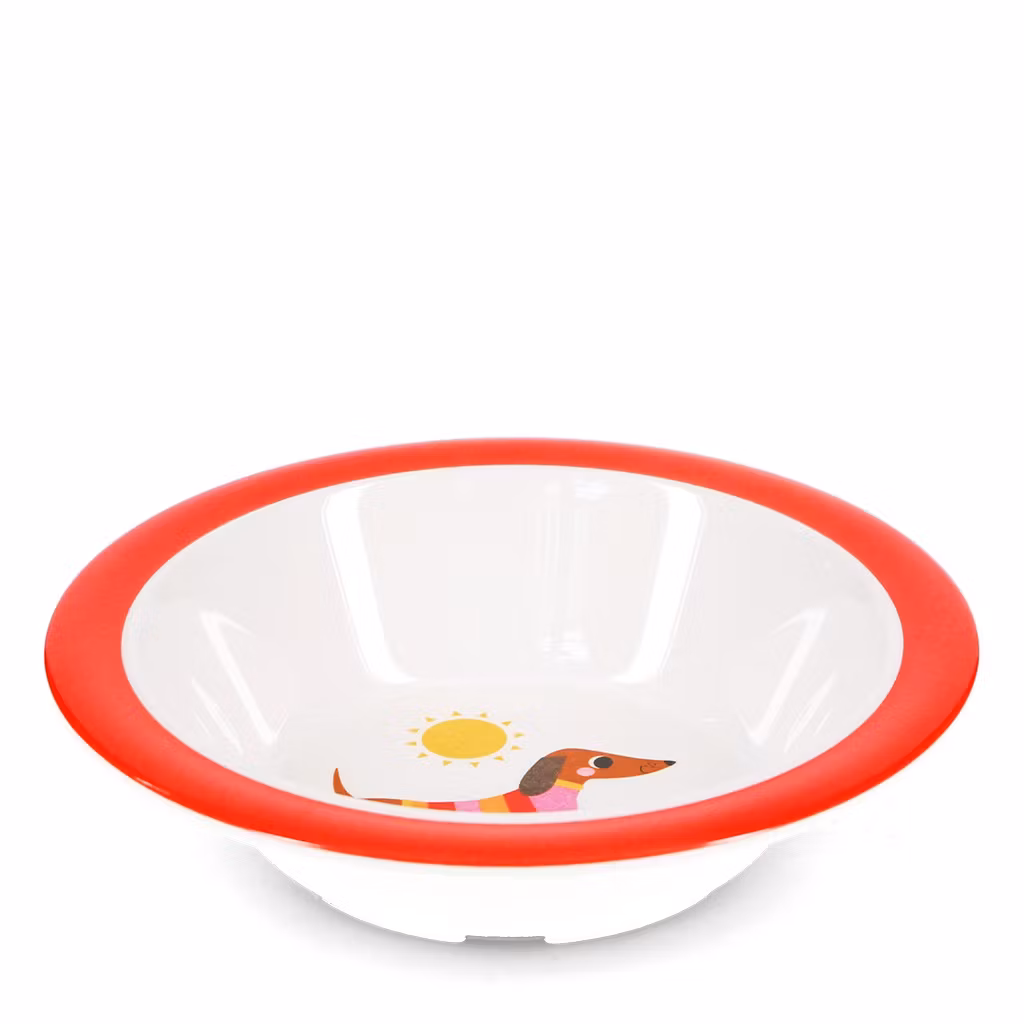 Söt melaminskål med röd kant och glad tax - perfekt för barnens måltider! Lätt, tålig och diskmaskinsäker. Gör vardagen roligare för 115 kr!