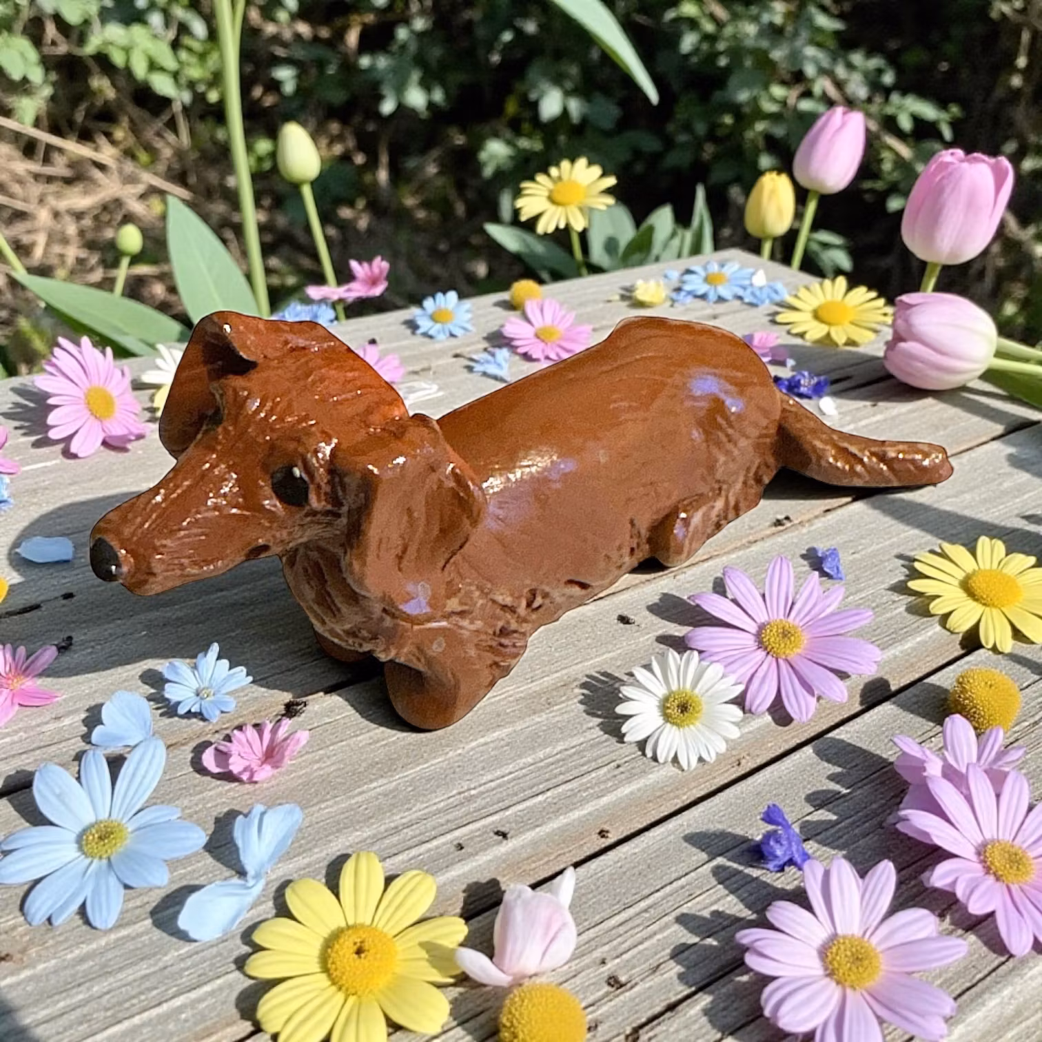 Taxen Ester är inspirerad av vår egen lilla Ester, en liten tax med ett hjärta som rymmer både klokhet, värme och en rejäl dos bestämdhet. I denna cirka 8 cm långa figur har jag försökt fånga just hennes uttryck – den där blicken som både frågar och bestämmer på samma gång. En liten figur som sprider lugn, glädje och karaktär var den än placeras.