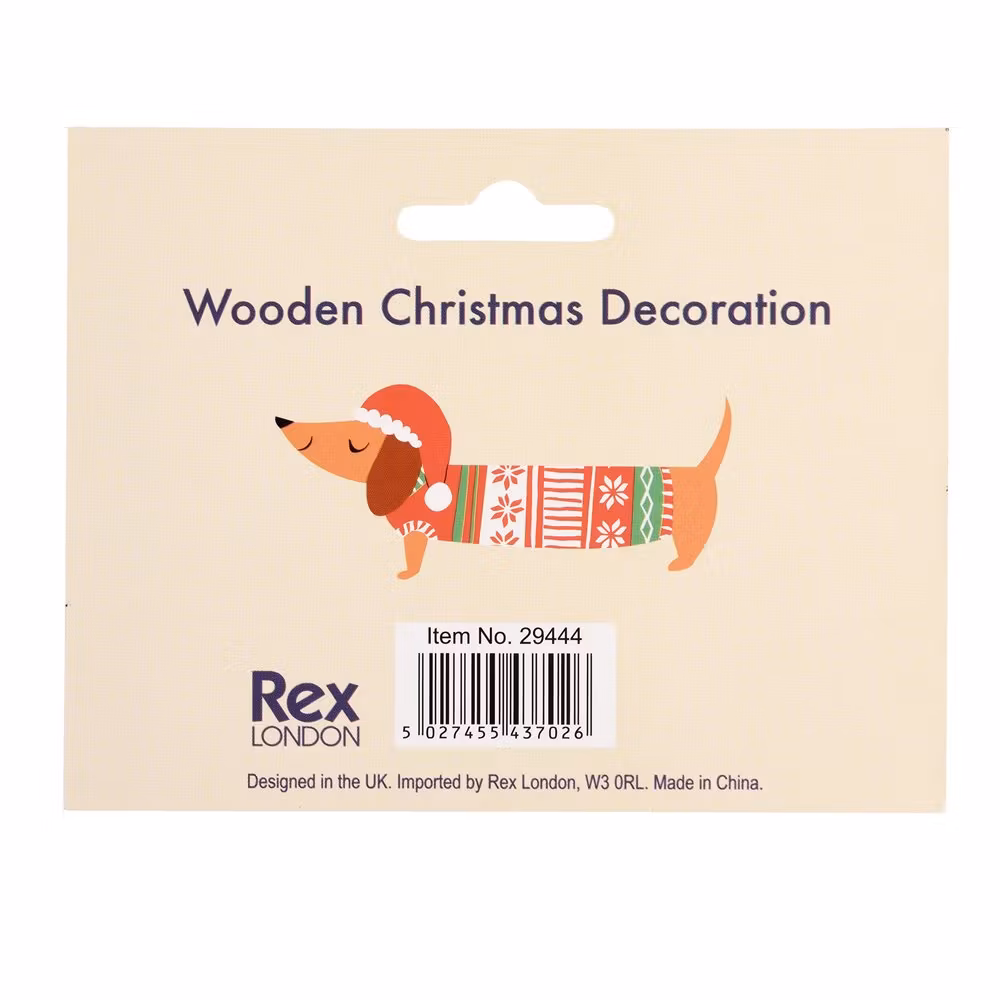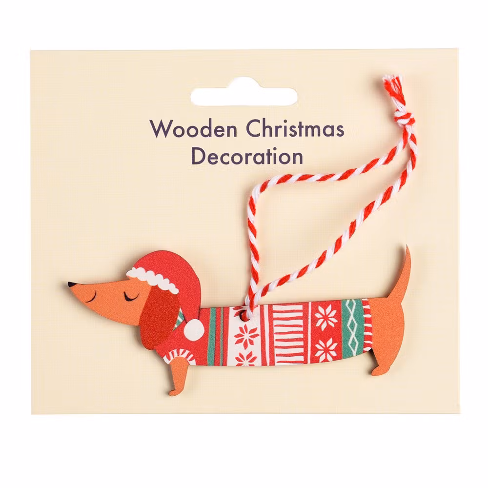 Söt liten tax i tomteluva och tröja att hänga i granen. Tillverkad i trä.