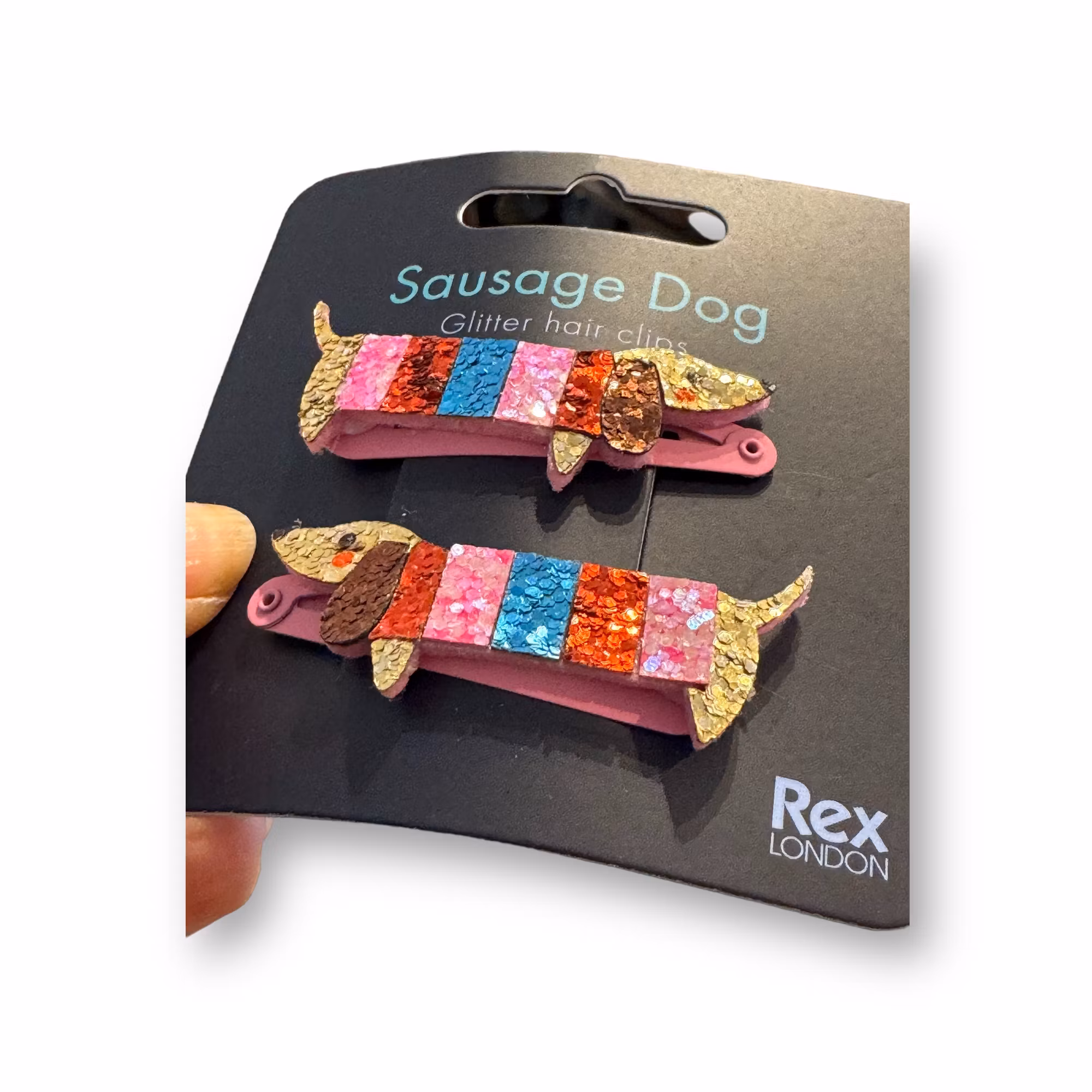 Två små söta hårspännen i metall med taxar som glittrar så fint.Stl: 5,3 x 2,2 cmPris: 69:- / 2-pack