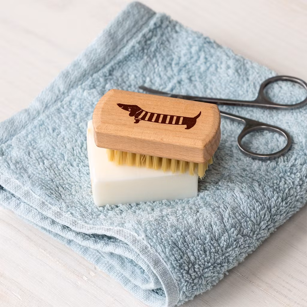 Söt mini nagelborste i bokträ med taxmotiv – perfekt för både barn och vuxna. Medelhårda borst för effektiv rengöring. Rolig design som gör nageltvätten enklare
