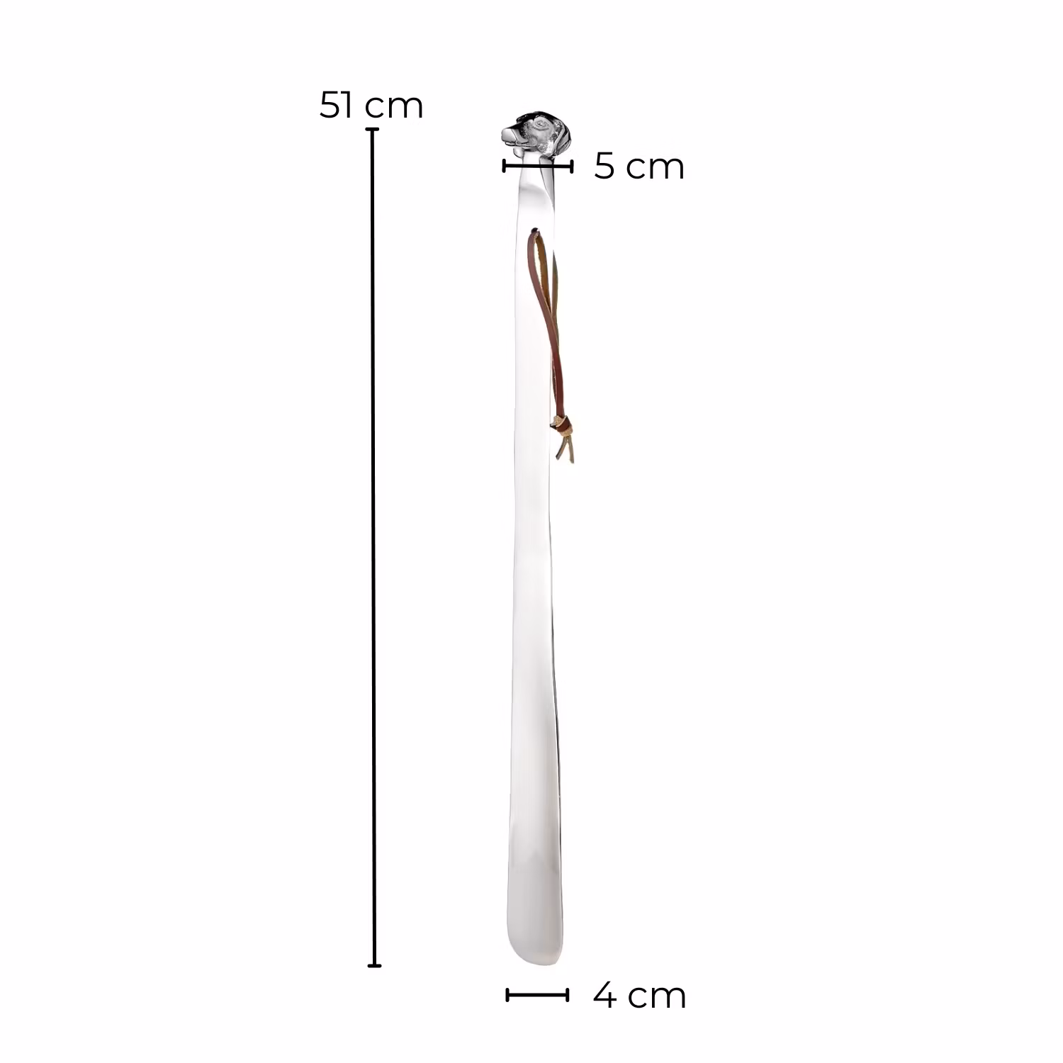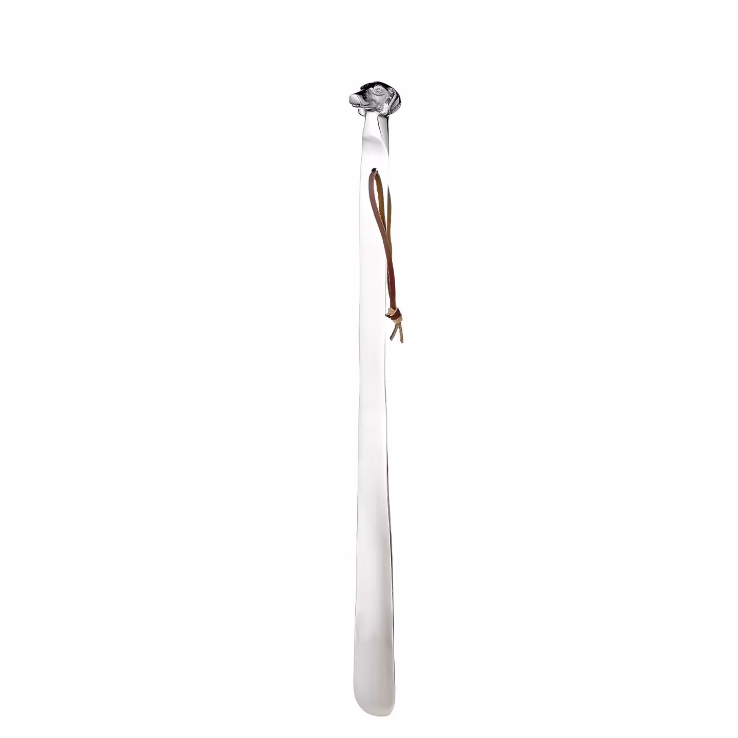 Elegant skohorn i metall med dekorativt taxhuvud. 51 cm långt, 4 cm brett, med praktiskt läderband för upphängning.