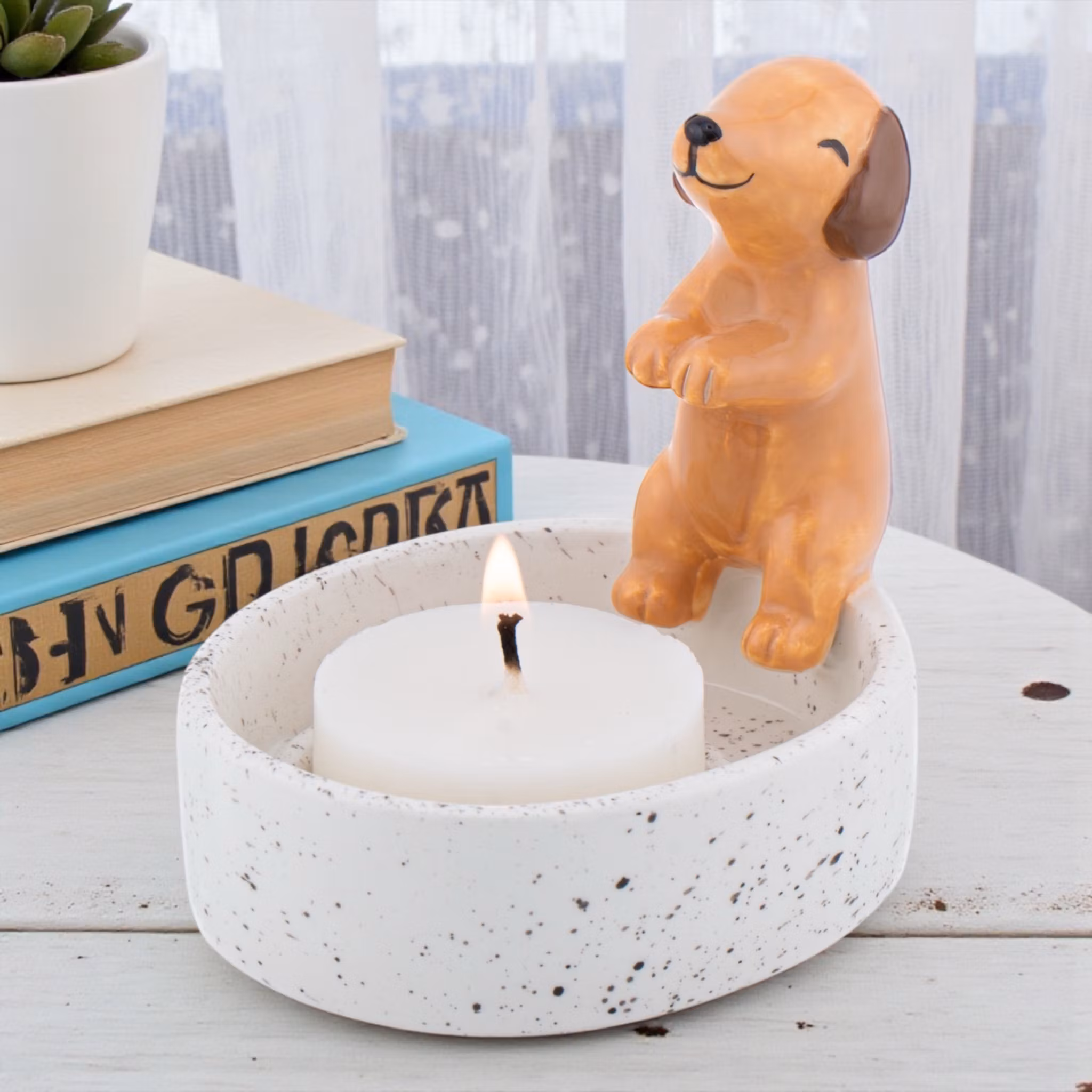 Den här charmiga ljusstaken är formad med en liten tax som sitter på kanten och sträcker fram tassarna mot värmen från ett tänd värmeljus. Tillverkad i dolomit ger den en fin tyngd och ett dekorativt uttryck som passar i både moderna och mer lekfulla hem. Ljusstaken blir ett varmt och stämningsfullt inslag på bordet, i fönstret eller på en hylla och är lika fin att använda året runt. Den är också en uppskattad present till taxälskare och till alla som tycker om inredningsdetaljer med humor och personlighet. En dekorativ liten ljusstake som sprider både ljus och leenden. Taxen har små stänk av svarta prickar som återfinns på bottenplattan. Är ingen defekt utan blir så under tillverkningen.