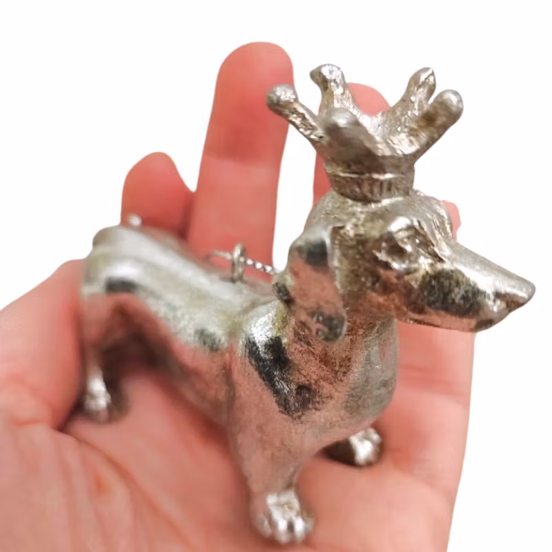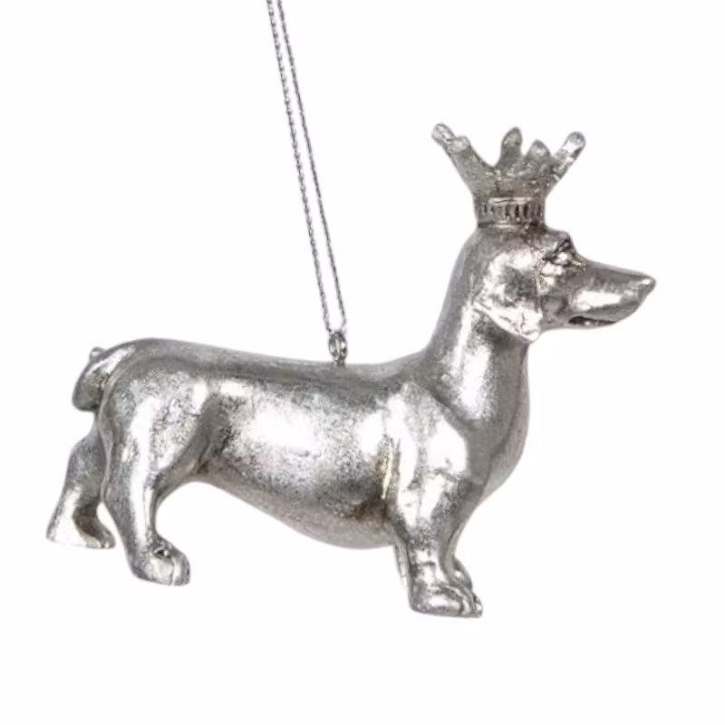Söt liten tax i silverfärg med krona på huvudet som du kan hänga eller ställa.