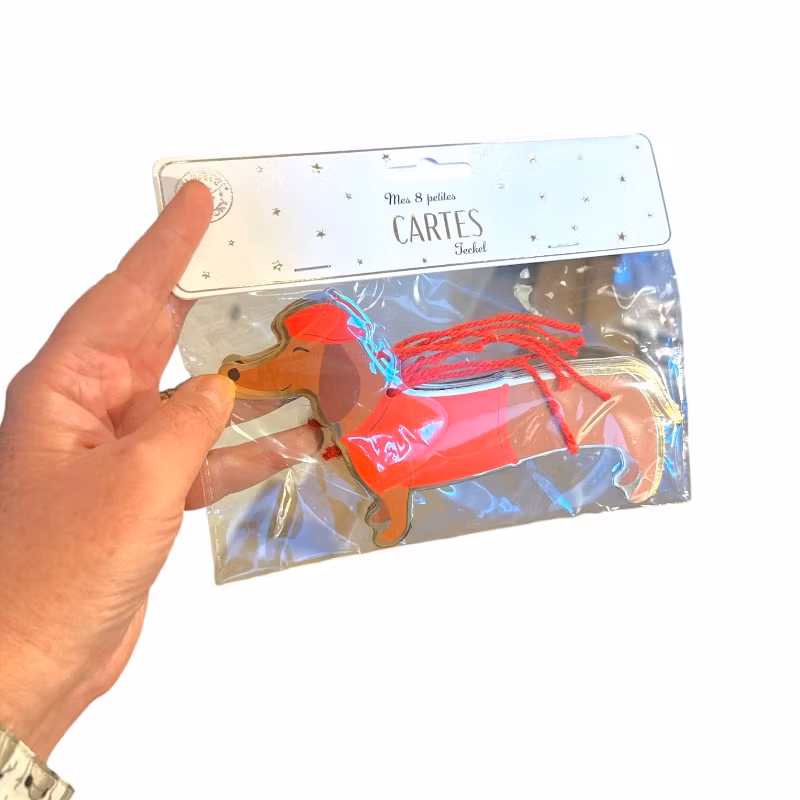 Stora söta paketkort i form av en tax med rött bomullssnöre i där du har plats att skriva på baksidan, 8 st per förpackning.Stl: 9,5 x 17 cmPris: 49:-/förp.Mate