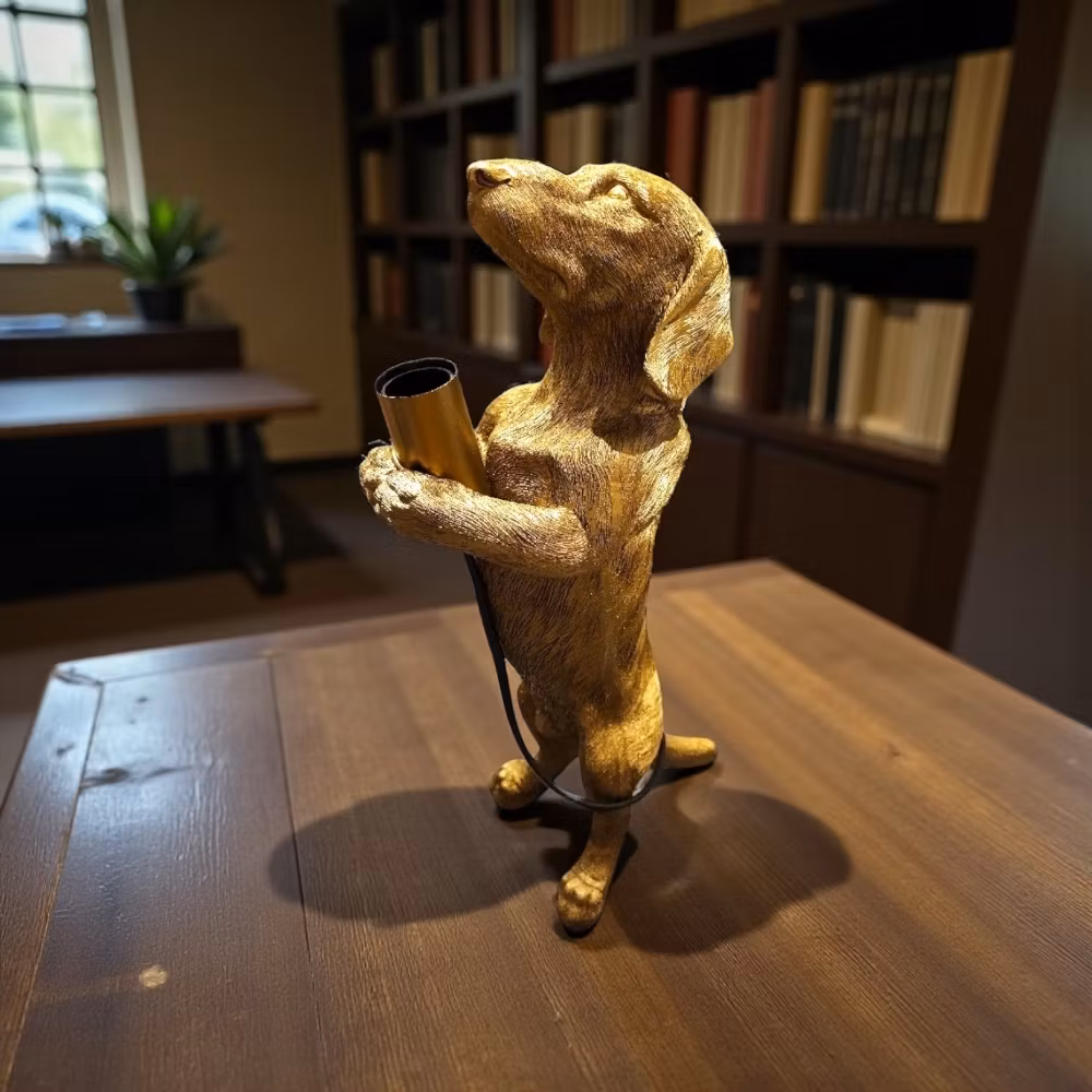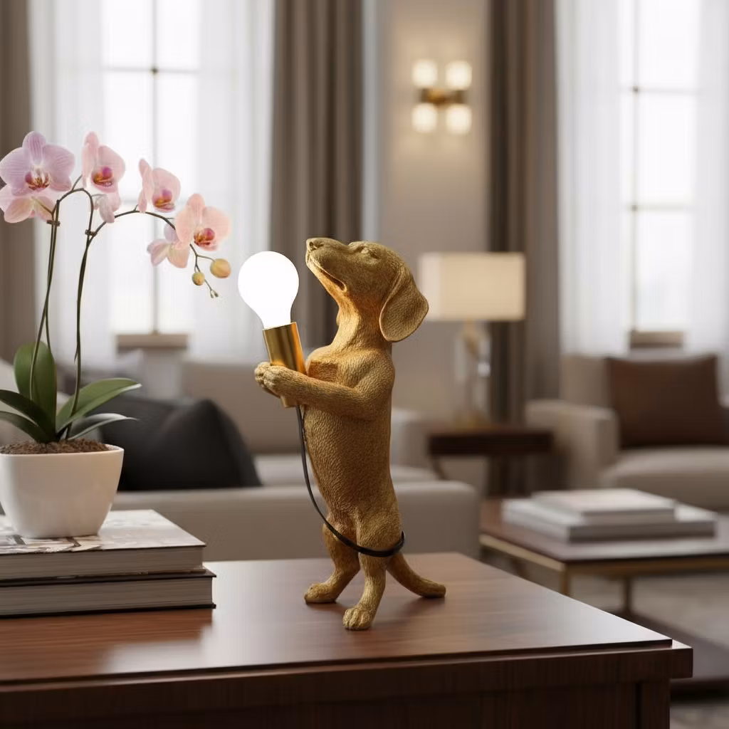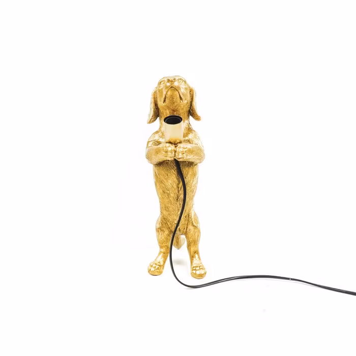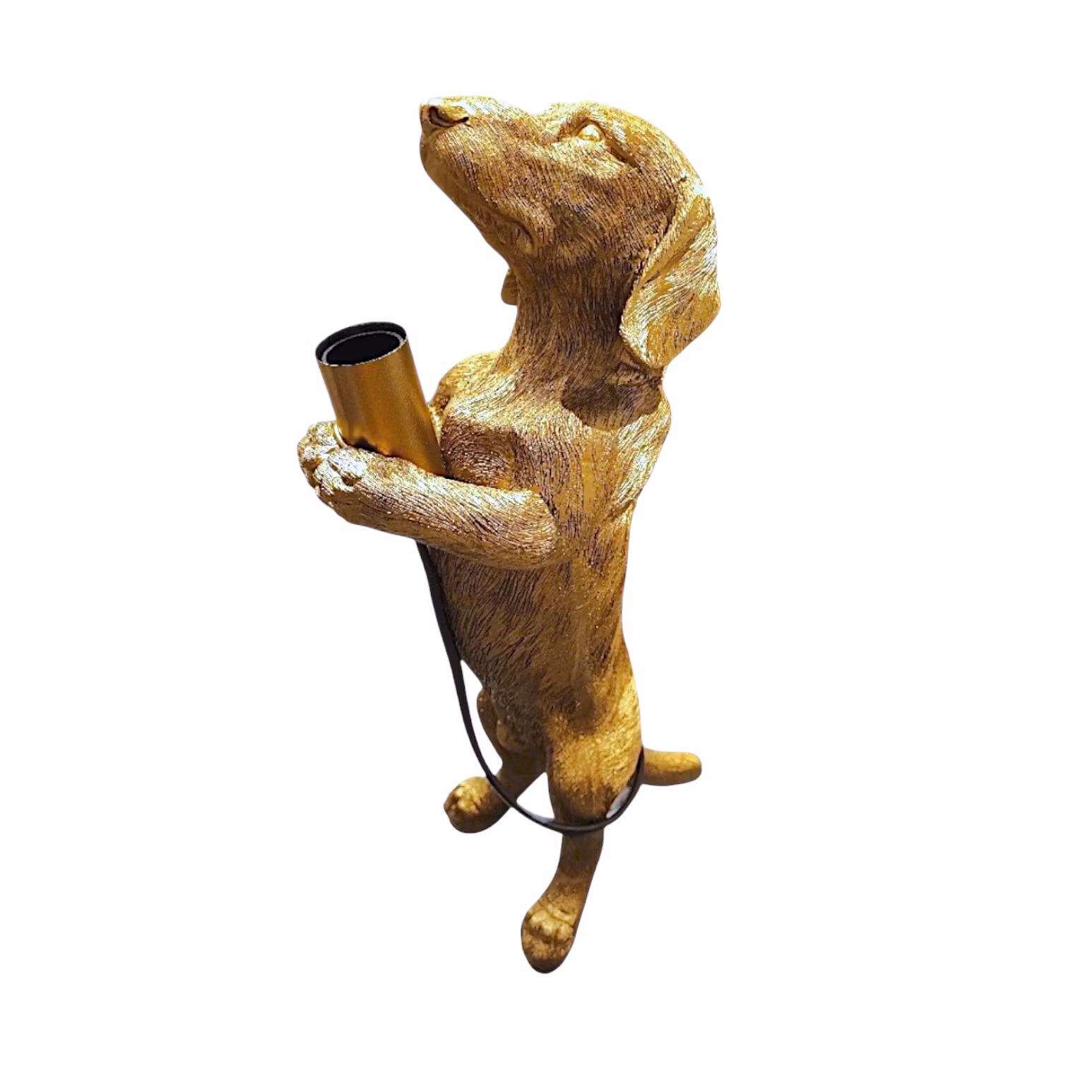 Ge ditt hem en charmig och originell touch med denna dekorativa lampa i form av en tax. Den ståtliga hunden står på bakbenen och håller glödlampan mellan sina framtassar, vilket skapar ett lekfullt men samtidigt stilrent uttryck. Den guldfärgade ytan ger en exklusiv känsla och gör lampan till ett blickfång i vilket rum som helst – perfekt för hallen, vardagsrummet eller som en unik detalj i kontoret.