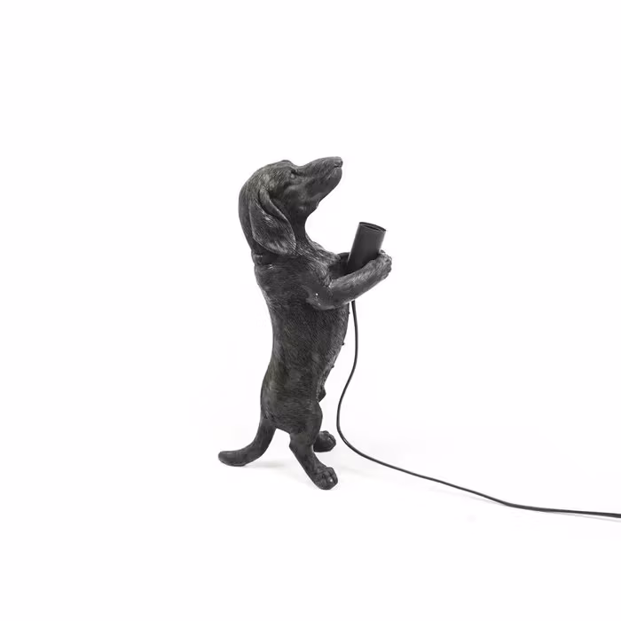 Ge ditt hem en charmig och originell touch med denna dekorativa lampa i form av en tax. Den ståtliga hunden står på bakbenen och håller glödlampan mellan sina framtassar, vilket skapar ett lekfullt men samtidigt stilrent uttryck. Den svarta ytan ger en exklusiv känsla och gör lampan till ett blickfång i vilket rum som helst – perfekt för hallen, vardagsrummet eller som en unik detalj i kontoret.