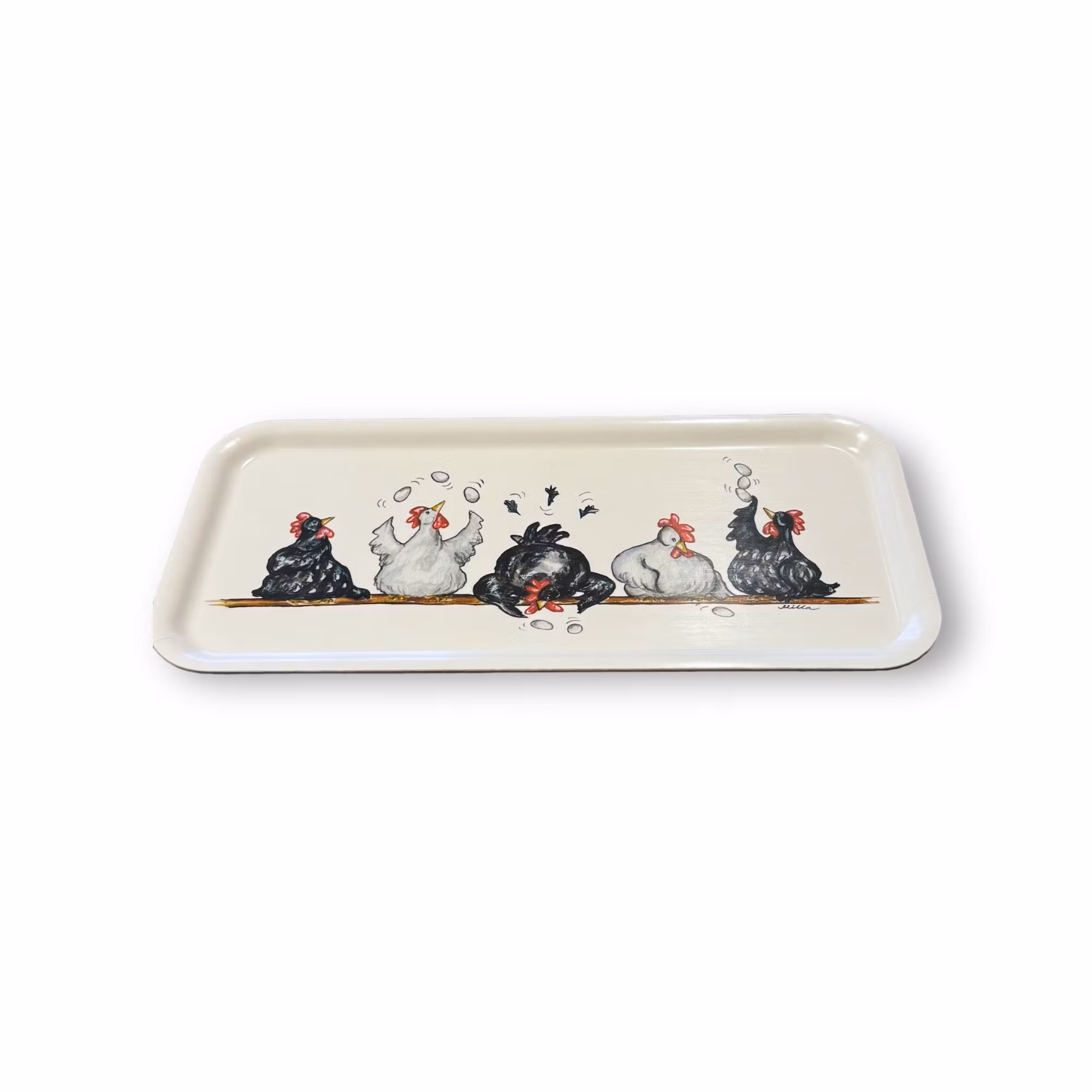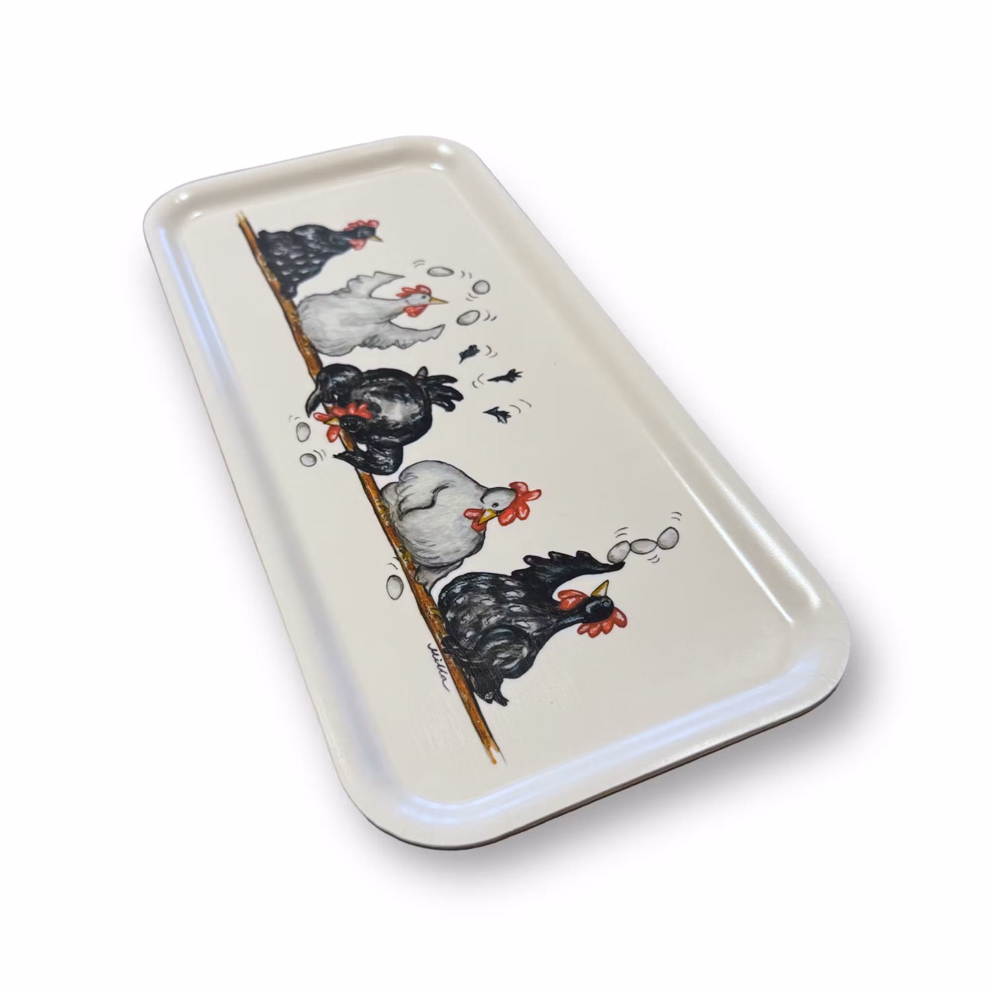 Denna avlånga bricka med charmigt motiv av värpande hönor ger en härlig lantlig känsla till ditt hem.