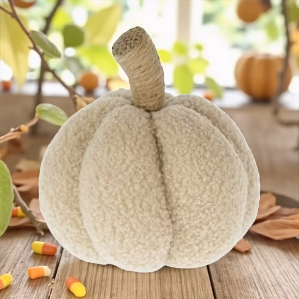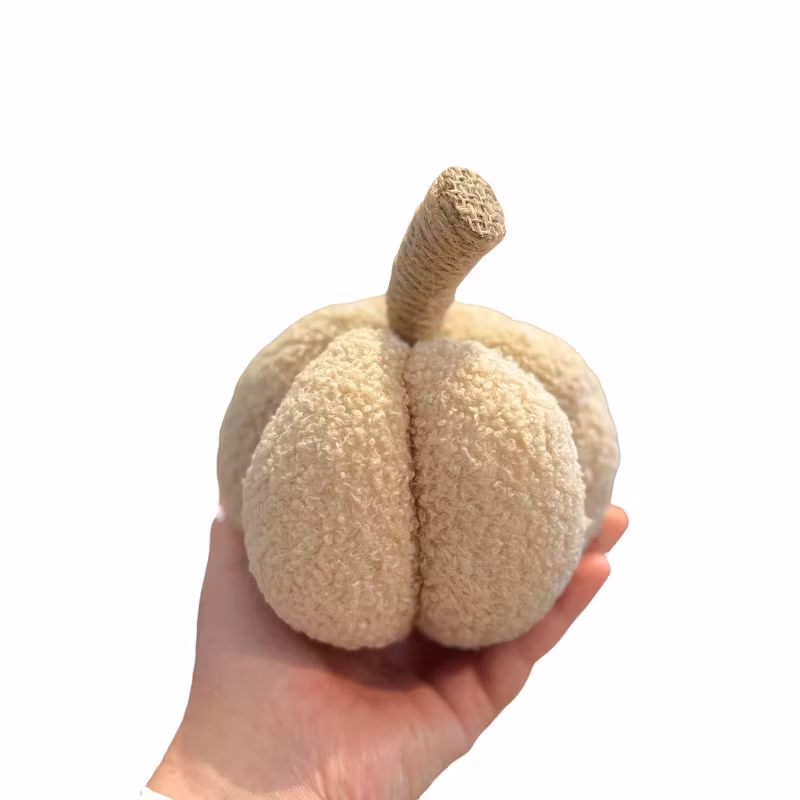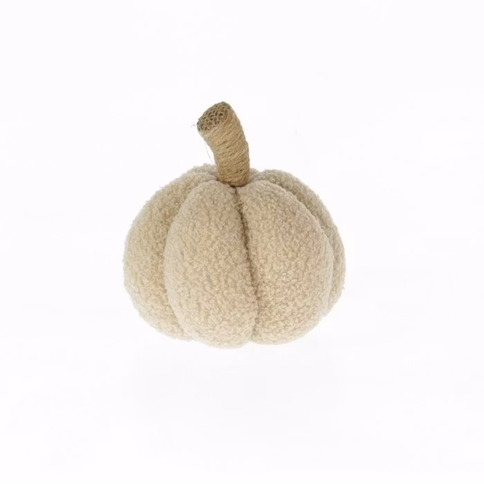 Alla pumpar behöver inte vara i höstens mysiga färgen utan även en lite ljusare färgskala är minst lika vackert. Denna pumpa är i ett lite ulligt tyg där stjälken är i jutegran.