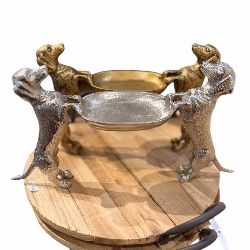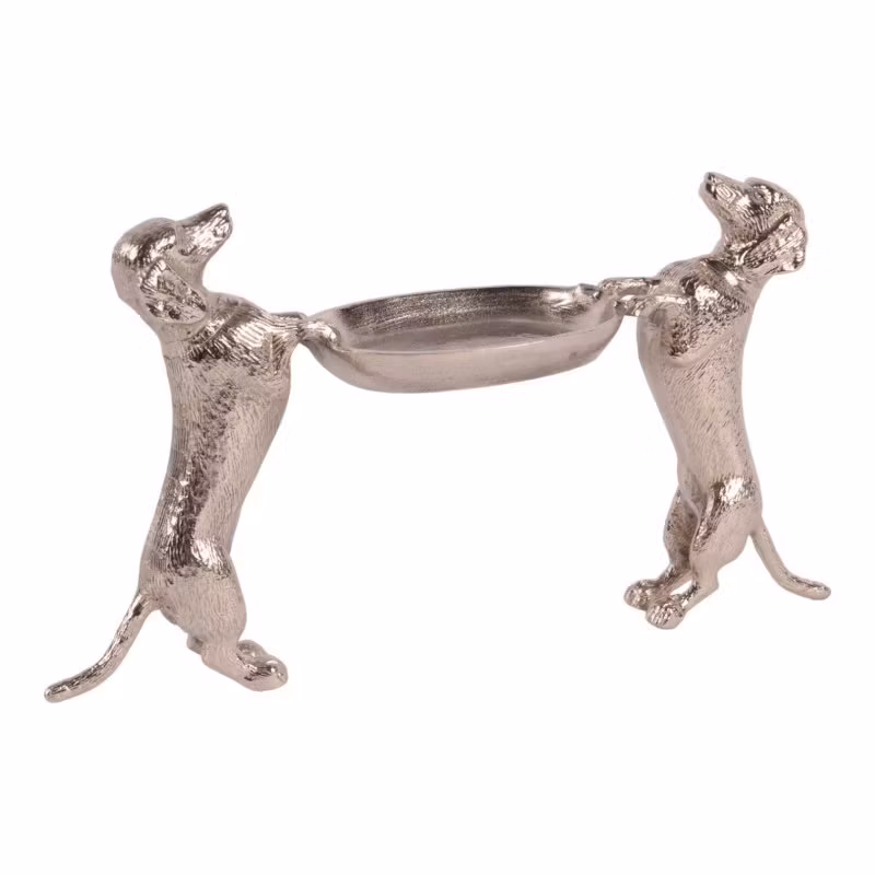 Två taxar som står på bakbenen och håller ett fat mellan sig med framtassarna. En trevlig liten inredningsdetalj som passar in i husets alla rum.