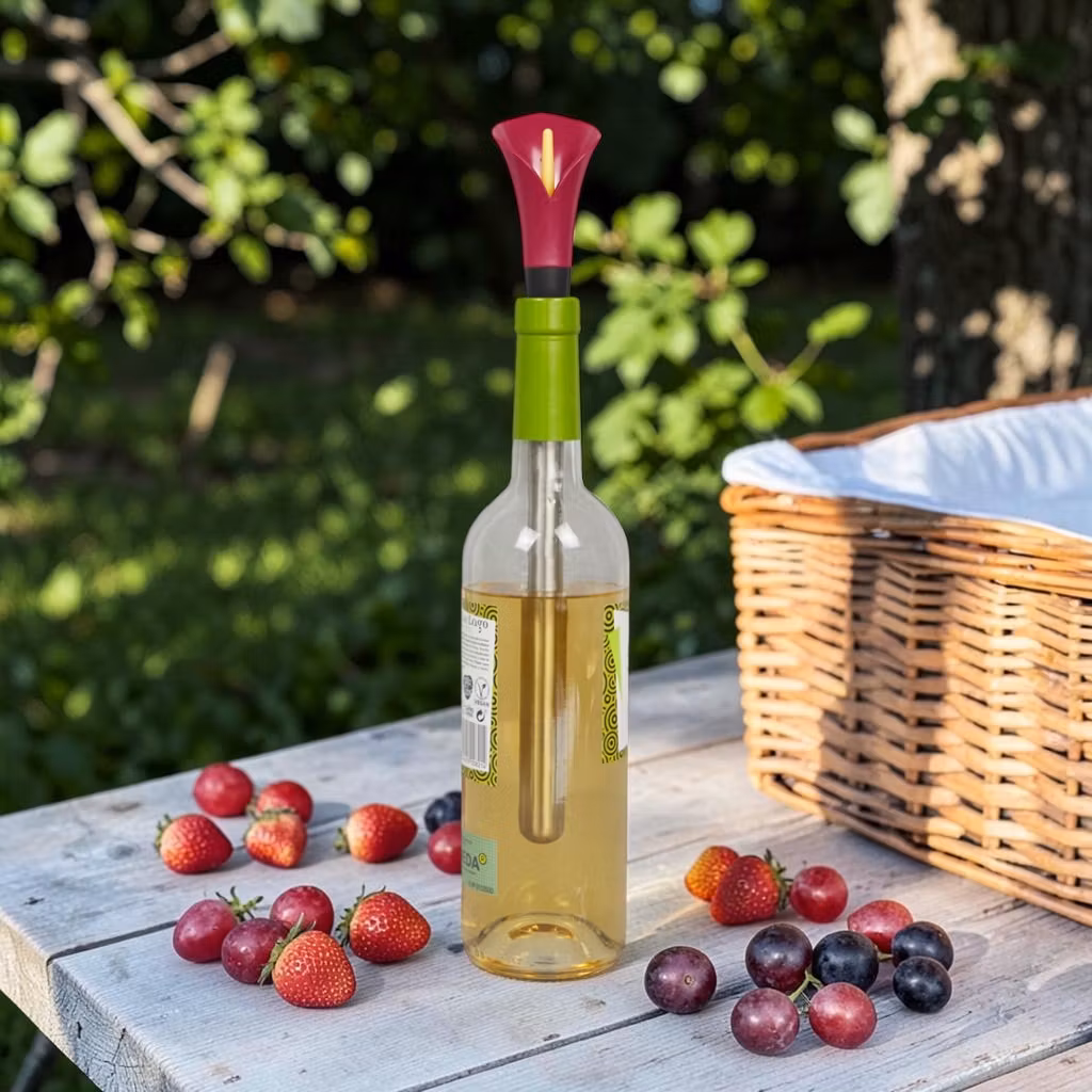 Elegant 3‑i‑1 vinkylare från Balvi med kylstav i rostfritt stål, dekanterare och droppfri hällpip i liljeform. Kyler, syresätter och serverar vin med stil.