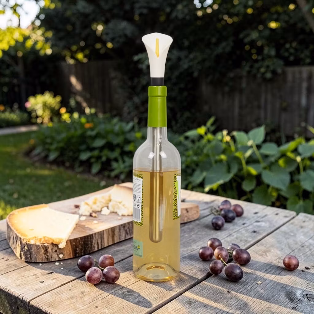 Elegant 3‑i‑1 vinkylare från Balvi med kylstav i rostfritt stål, dekanterare och droppfri hällpip i liljeform. Kyler, syresätter och serverar vin med stil.