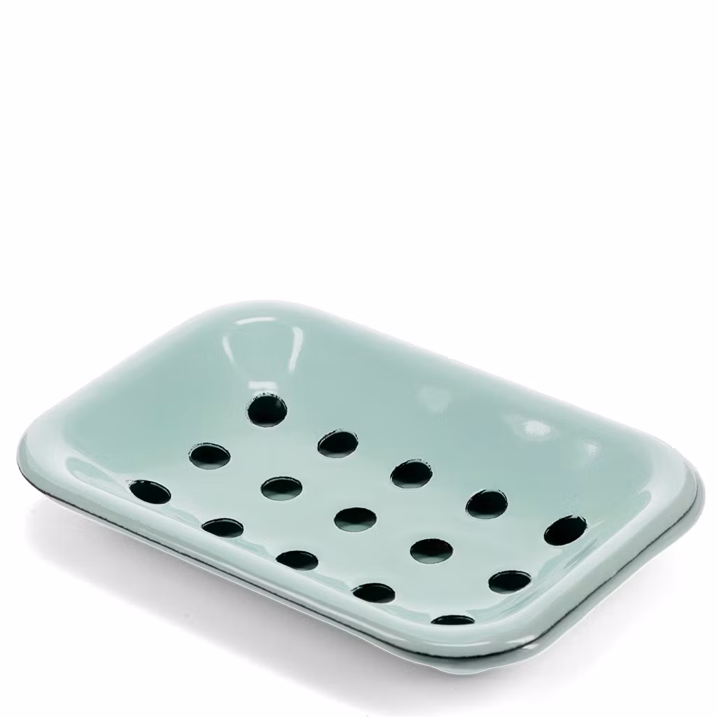 Retro tvålkopp i mintgrön emalj med dräneringsbricka, ger rustik charm och håller tvålen torr. Enkel rengöring. Perfekt för stilfullt badrum.
