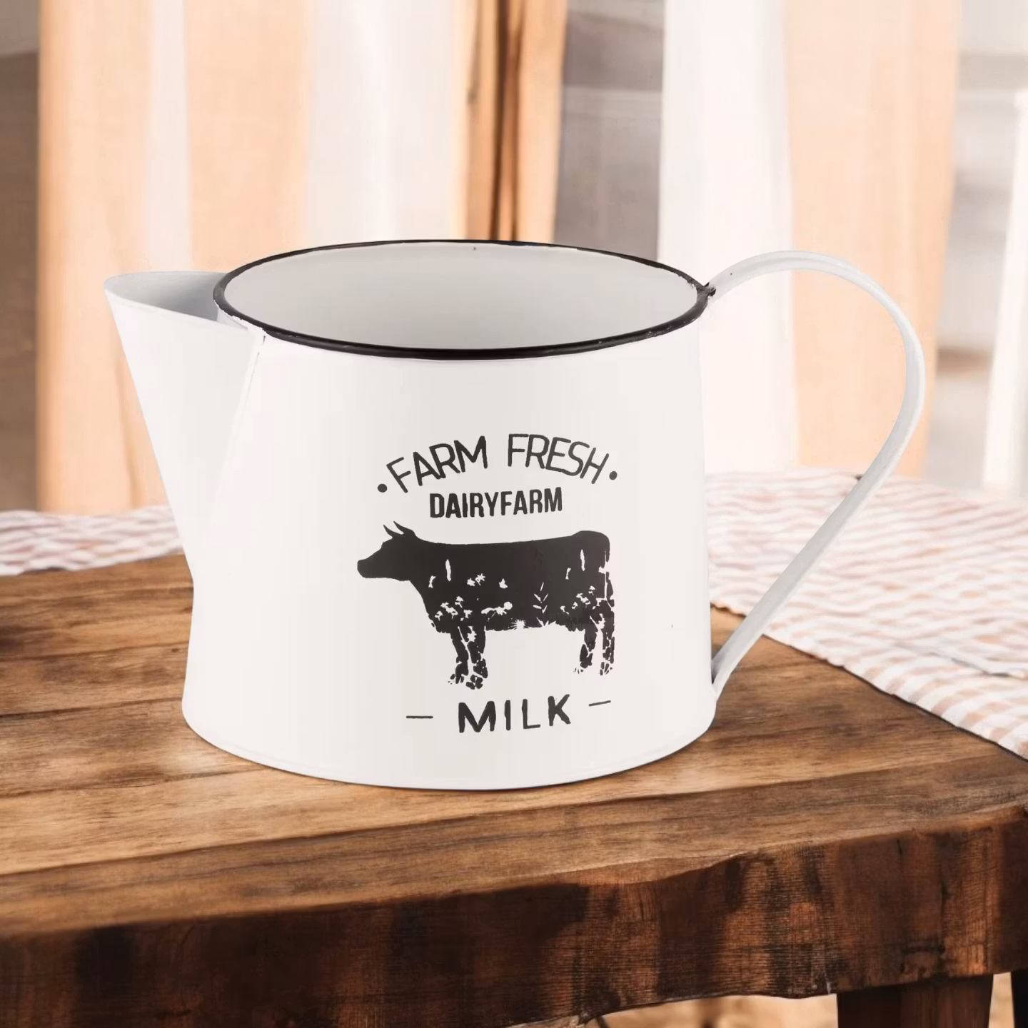 Rustik kruka utformad som en kanna, tillverkad i vitmålad plåt och prydd med ett lantligt motiv av en ko i svart.