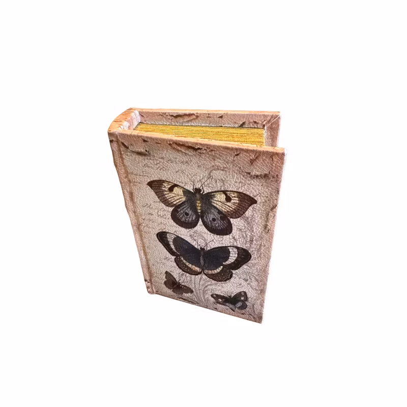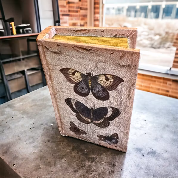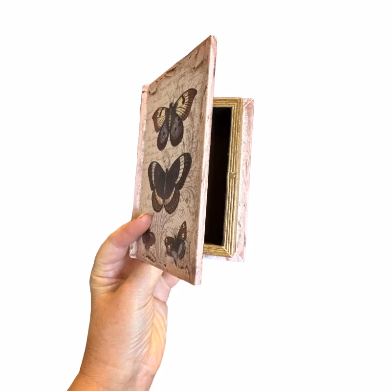 Boklåda i fin design med fjärilar på framsidan och ryggen. Fin att ha stående i bokhyllan eller liggande framme på soffbordet.Stl: 15 x 10 x 3,5 cm, inner