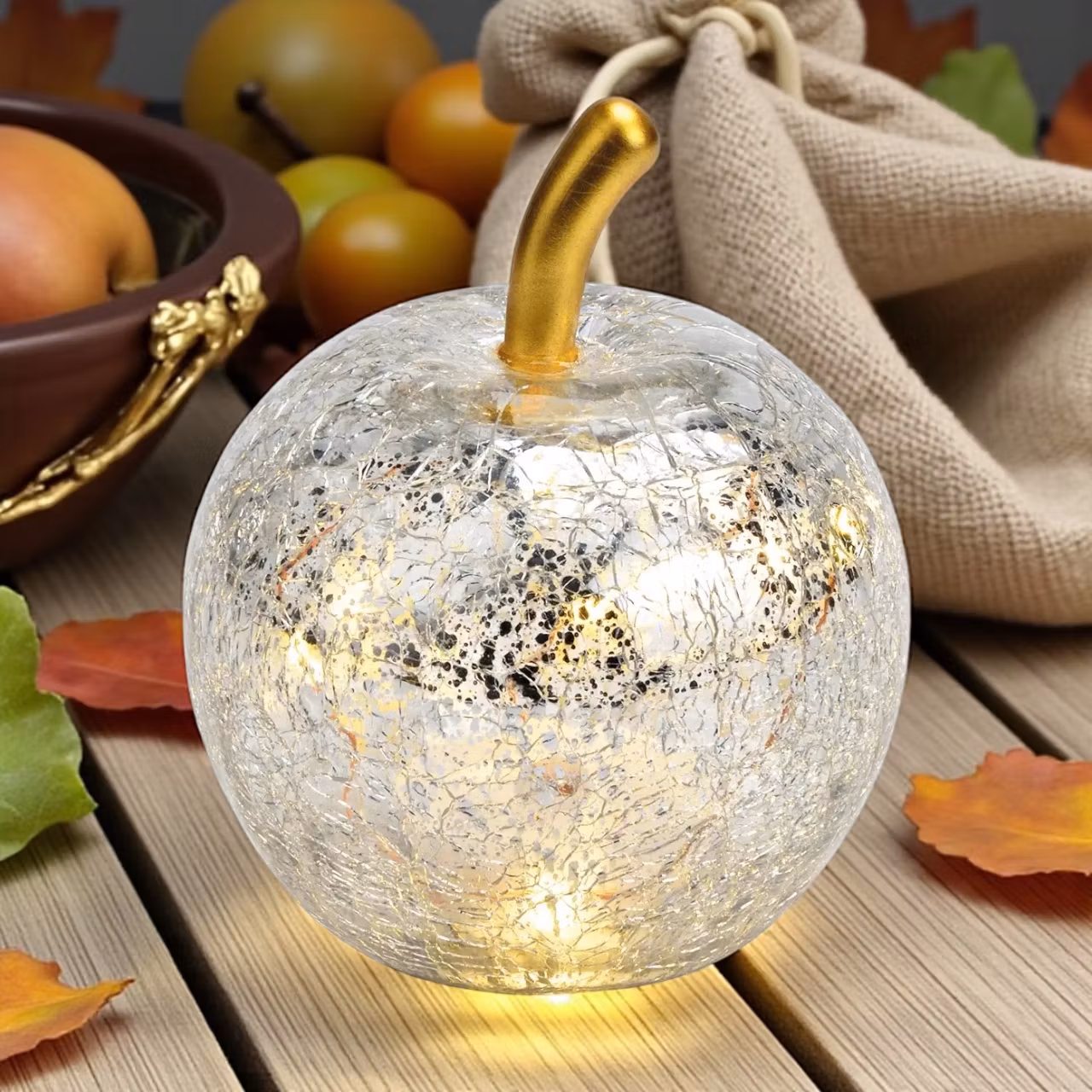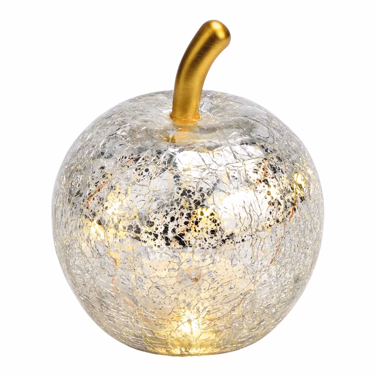 Dekorativt glasäpple i silverfärgat glas med inbyggt LED-ljus och timerfunktion. Batteri ingår – perfekt som juldekoration eller stämningsbelysning året om.