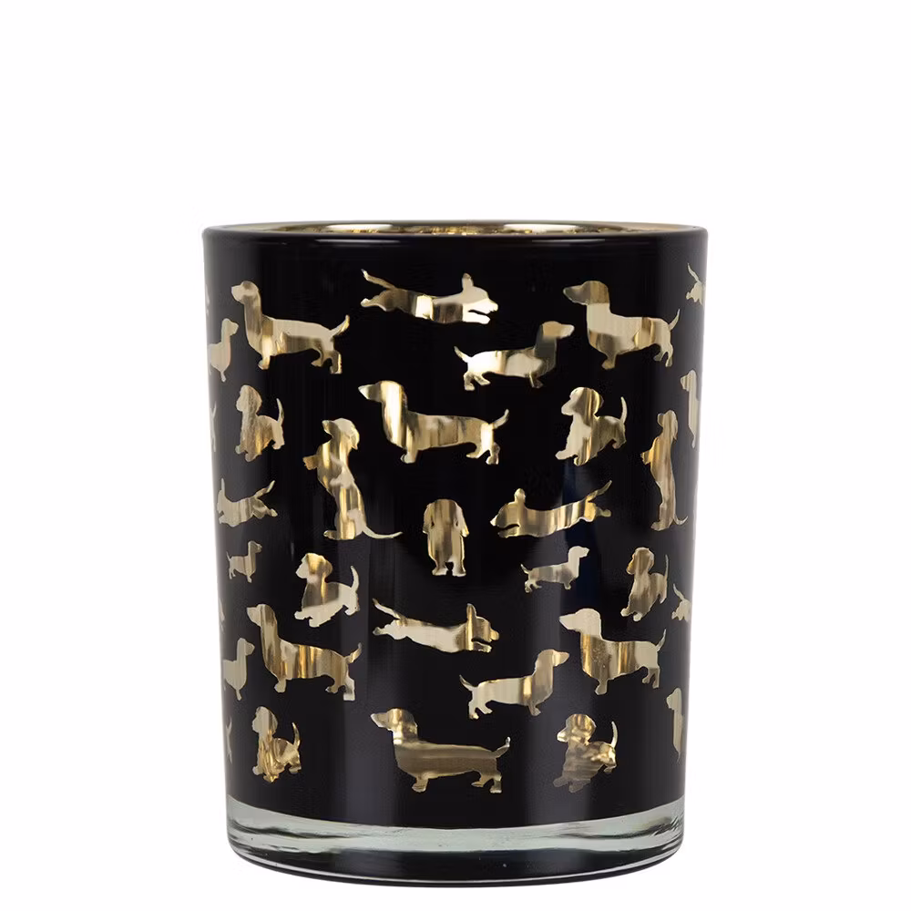 Mellanstor ljuslykta med guldfärgad insida och svart utsida med en massa taxar på. Ett måste för alla oss taxägare!