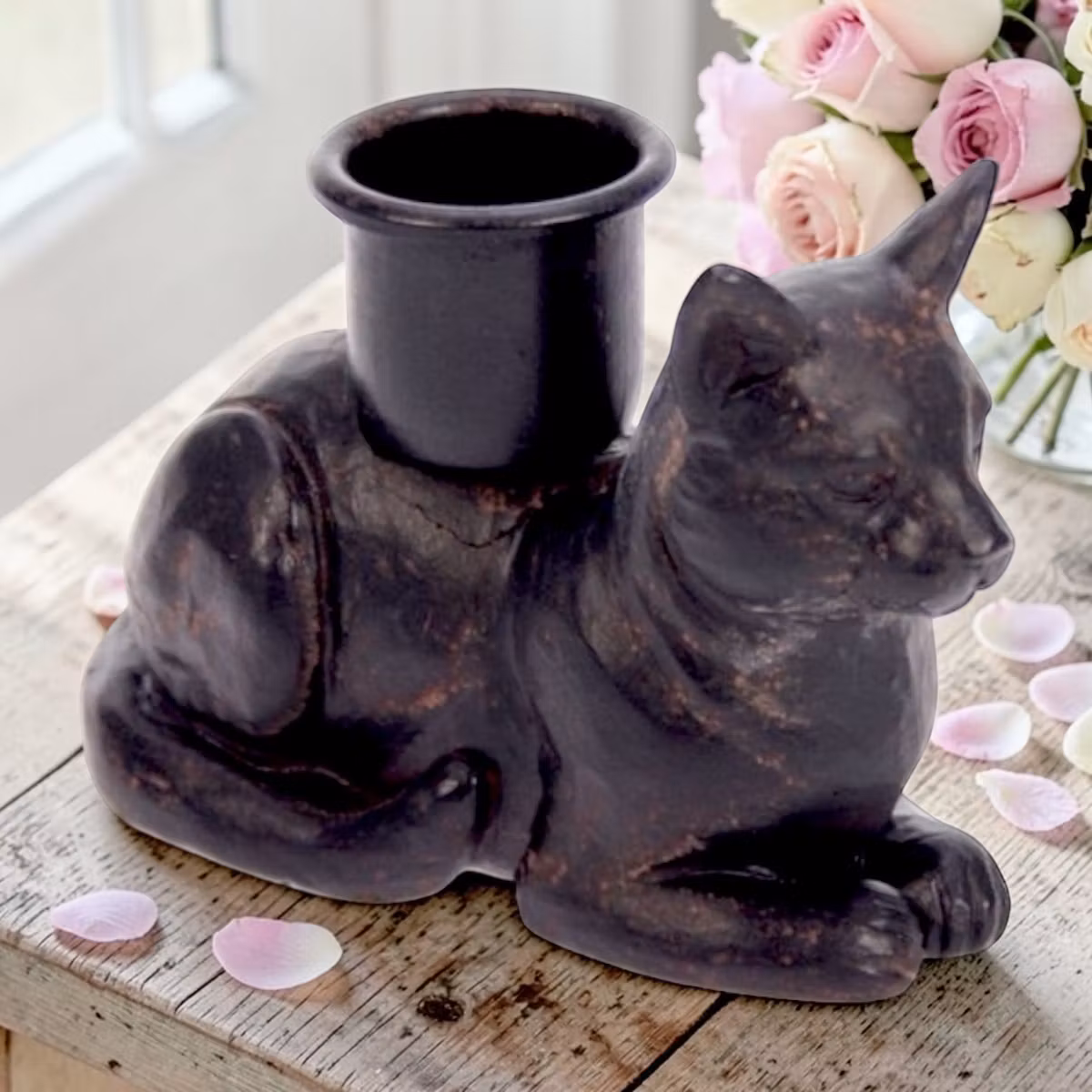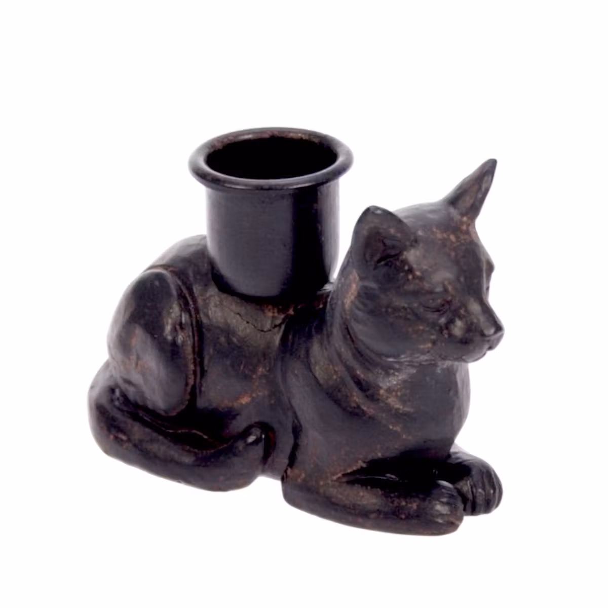 En charmig och stilren ljusstake i form av en svart katt som ligger avslappnat med ljushållaren placerad på ryggen. Den lekfulla designen gör den till en dekorativ inredningsdetalj som passar lika bra i vardagsrummet som på nattduksbordet eller i hallen. Ljusstaken är anpassad för vanliga stearinljus och ger ett mysigt sken samtidigt som katten tillför en personlig och lite humoristisk touch. Med sina mått på 9 × 6,5 cm är den lätt att placera och blir en fin present till både kattälskare och den som uppskattar unika detaljer i hemmet.
