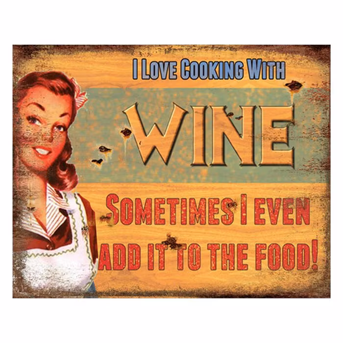 Plåtskylt "I love cooking whit wine...."Hål i alla fyra hörnen för upphängning.