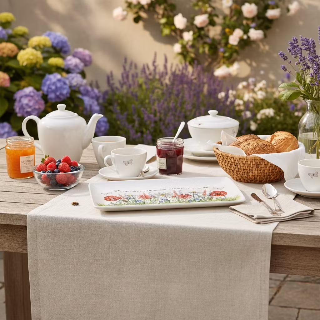 En assiett som sprider ren sommarkänsla vid varje dukning. Det blommiga motivet och den välkända sångraden ger tallriken en lekfull och nostalgisk ton som passar perfekt till sommarens frukostar, fikastunder och små pauser i solen. Formen är nätt, uttrycket är färgstarkt och helheten blir en glad detalj som lyfter både bordet och humöret. Assietten är min formgivning för Nääsgränsgården och ingår i en serie med flera matchande produkter för dig som vill skapa en enhetlig och somrig dukning.