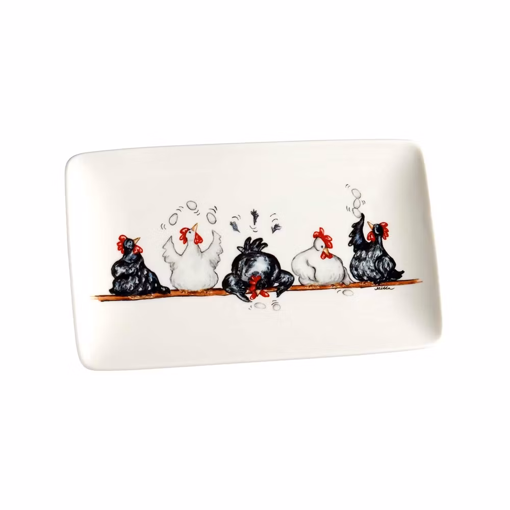 Hönor på rad, en charmig och rustik tallrik. En lekfull och lantlig assiett prydd med hönor, perfekt för allt från smörgåsar till fikastunder.