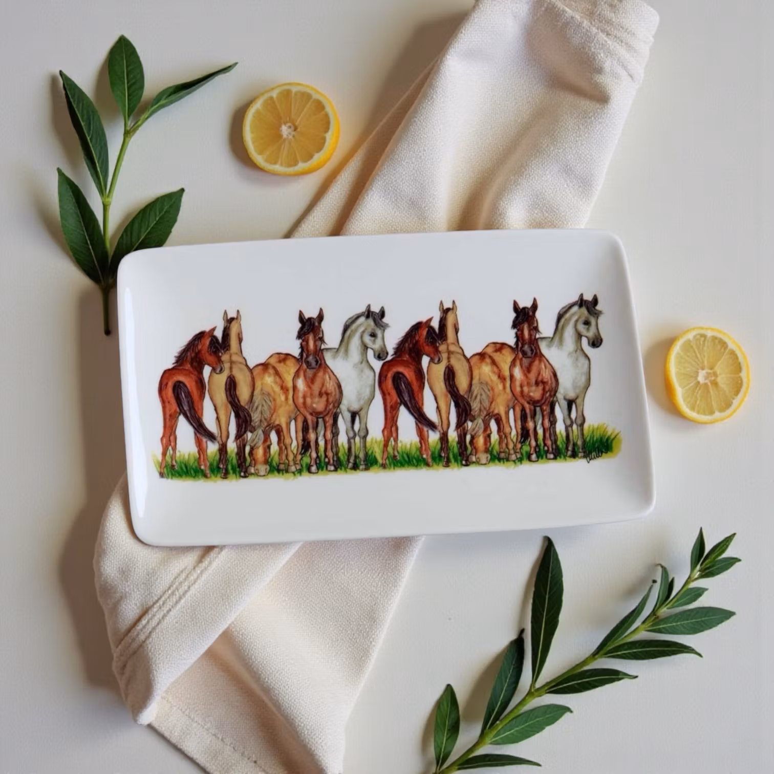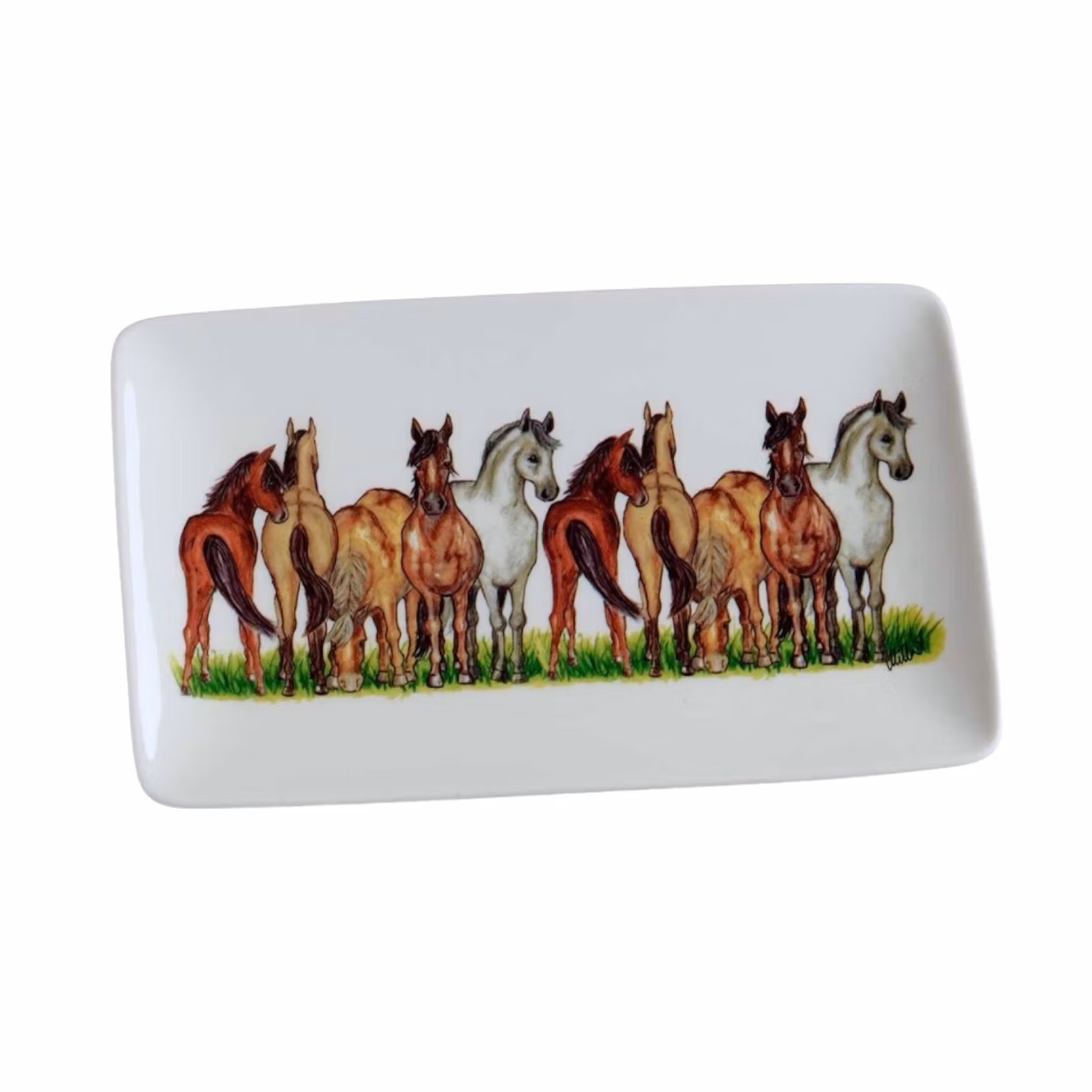 Avlång assiett i porslin med motiv av hästar som står på rad och tittar ut. Formgiven av mig, Camilla för Nääsgränsgården. Perfekt för smörgås eller tårta.