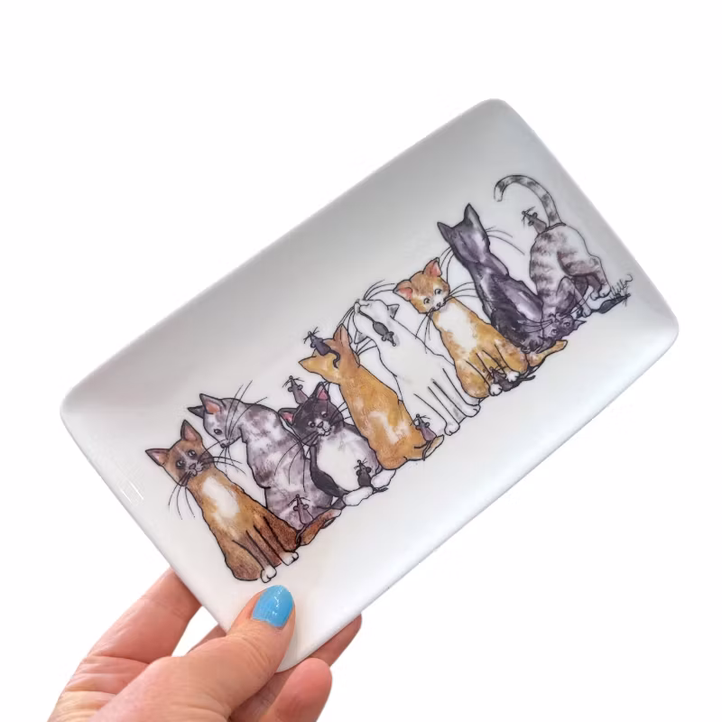 Katter i olika färger smyckar denna stilrena avlånga assiett.
