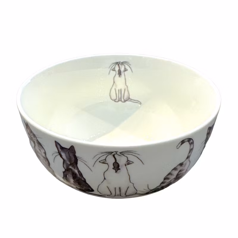 Skål med katter, vit katt på insidan av skålen. Passar lika bra till frukostflingorna som till godiset.