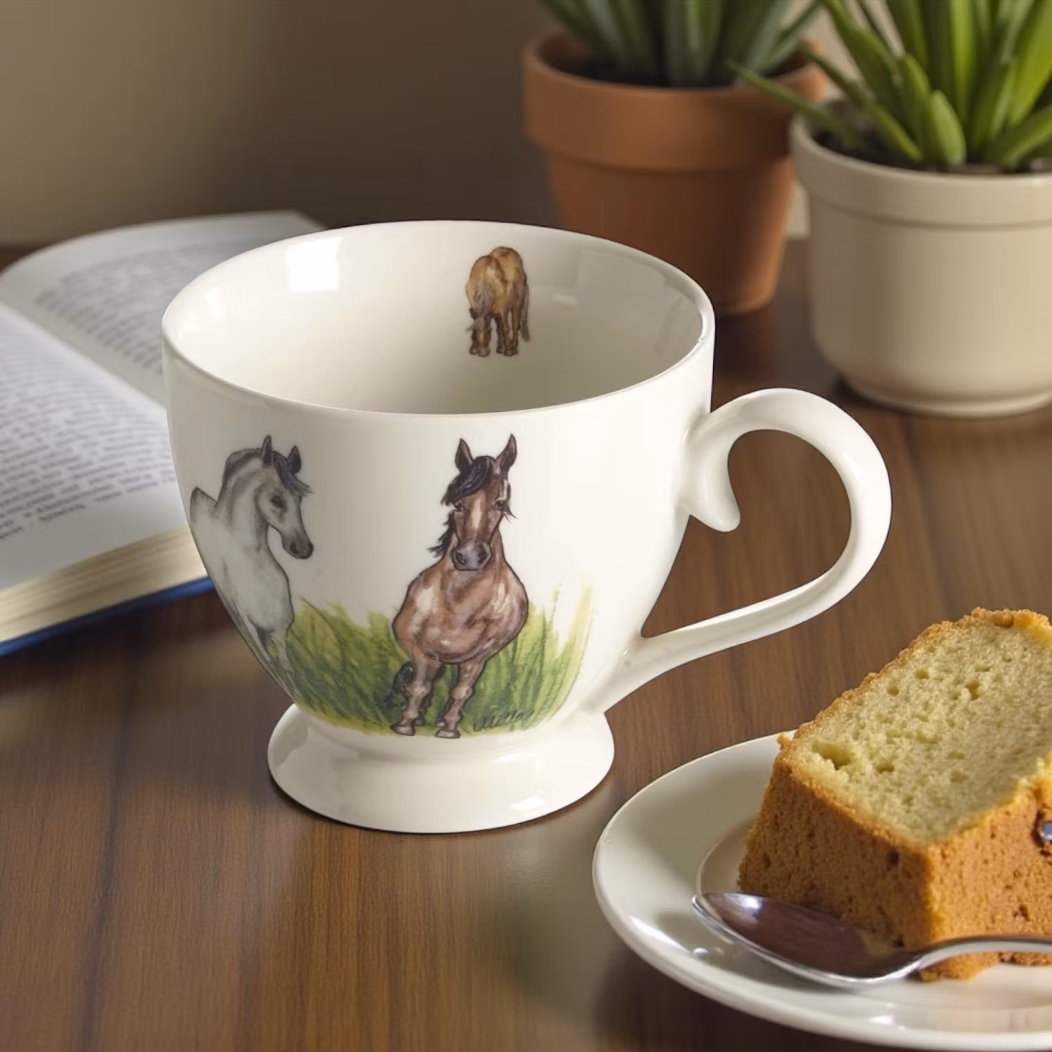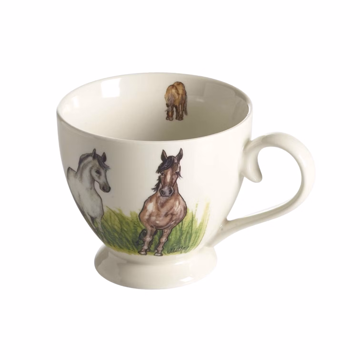 Stor tekopp i porslin med motiv av hästar som står på rad och tittar ut. Formgiven av mig, Camilla för Nääsgränsgården. Rymmer 40 cl.