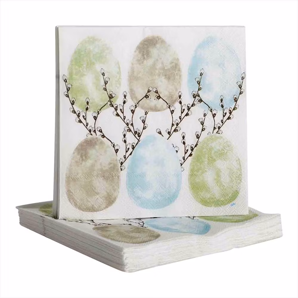 Lunchservetter med ägg i pastell och videkvistar. Fint motiv att duka med till påsk.