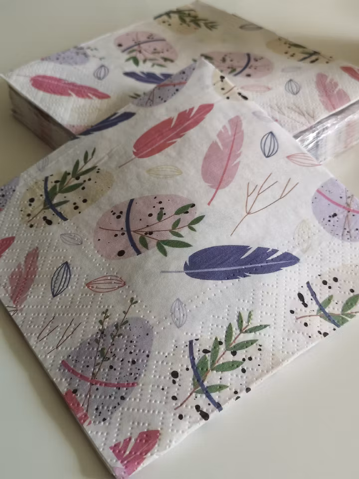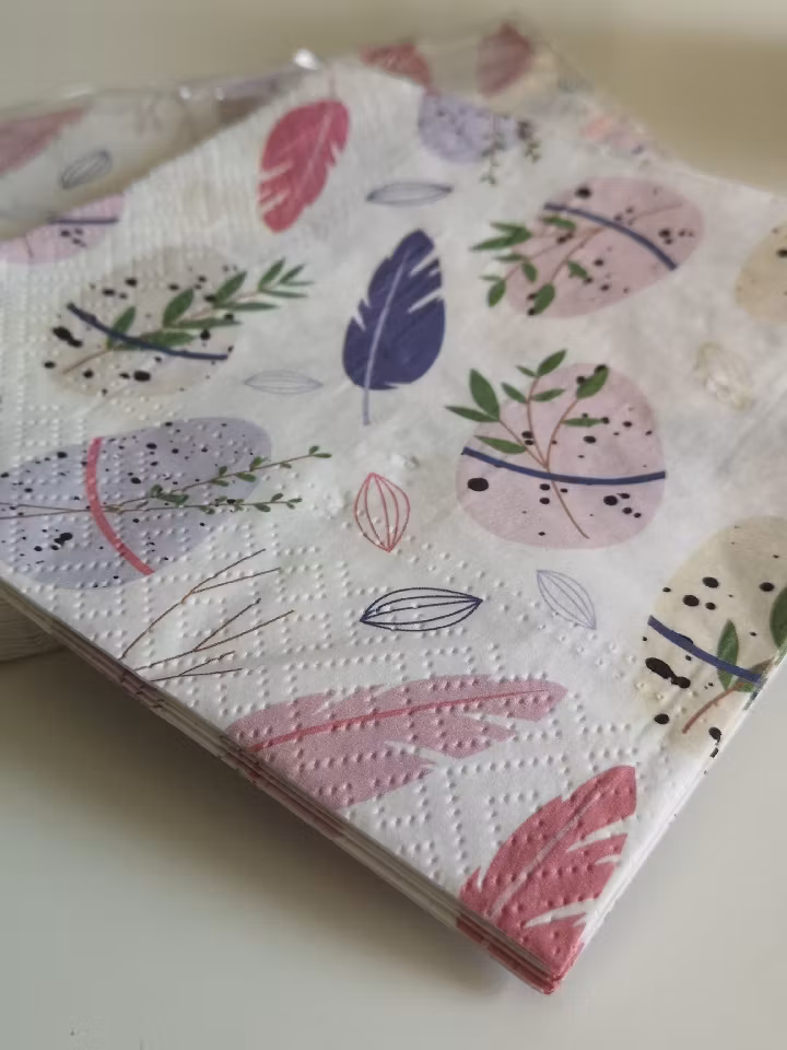 Servetter med påskägg, fjädrar mm i rosa, lila nyanser och lite grönt!