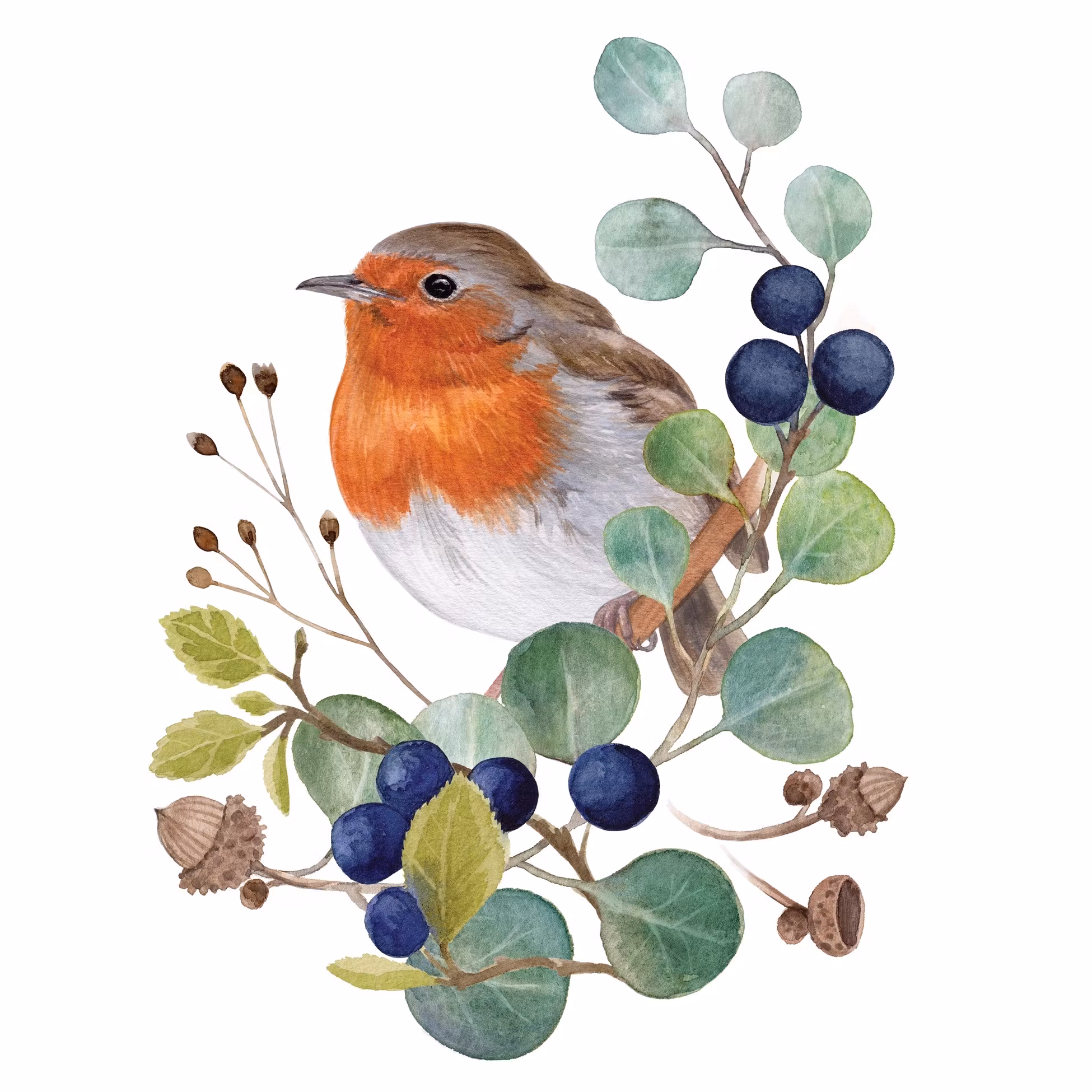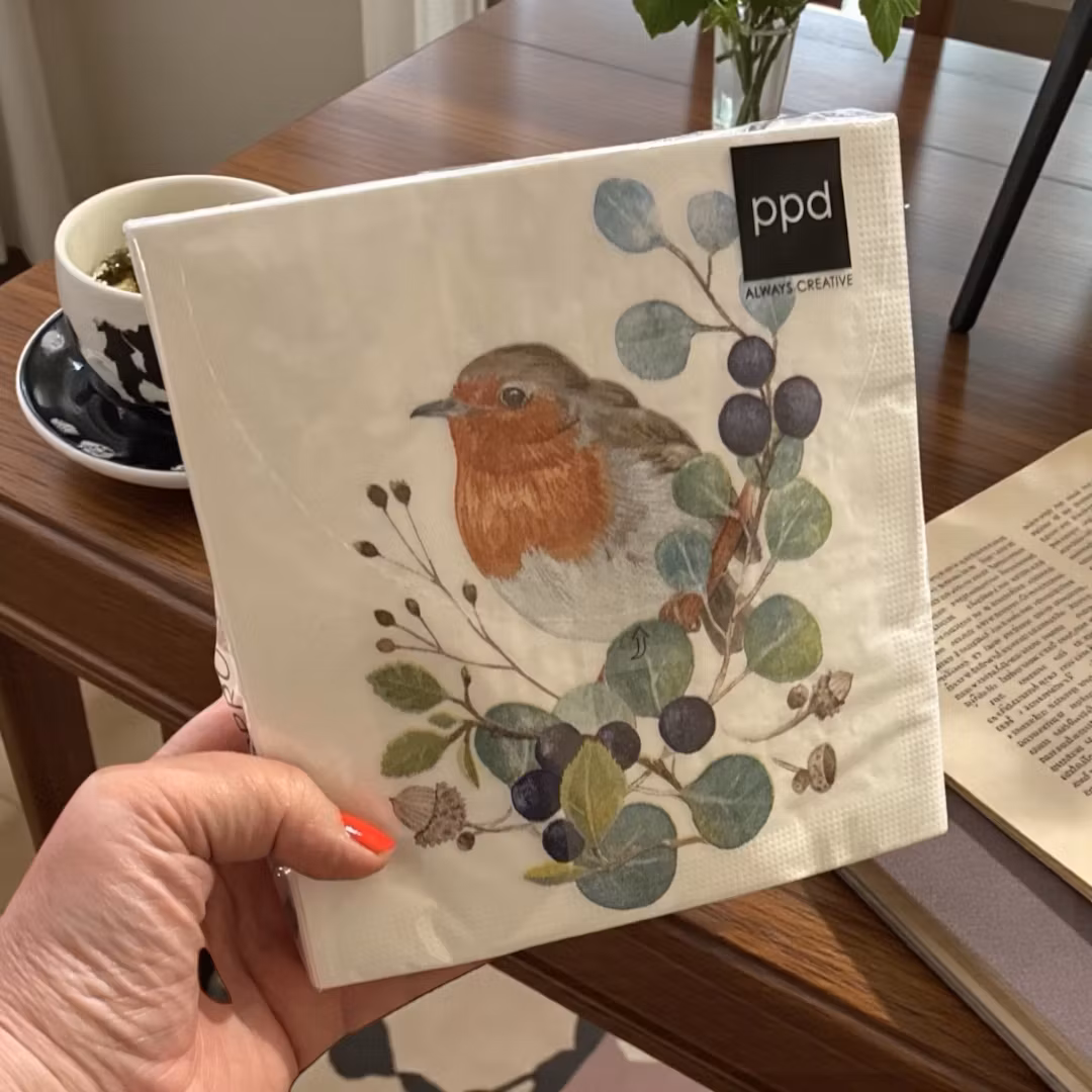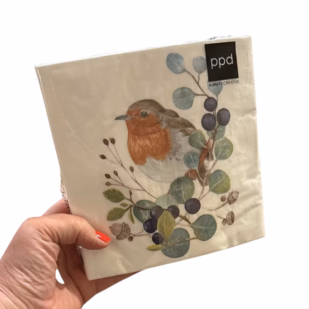 Dessa servetter pryds av en charmig rödhake som sitter på en gren, omgiven av harmoniska färger i grönt, blått och ljust brunt mot en vit botten. Motivet ger en stilfull och naturlig känsla som passar perfekt både till höstens middagar och till julens festliga dukningar. Med måtten 33 x 33 cm är servetterna praktiska och lagom stora för både vardag och fest, samtidigt som de tillför en dekorativ detalj som lyfter hela bordet. En vacker kombination av funktion och design som skapar stämning och gör varje tillfälle lite mer speciellt.