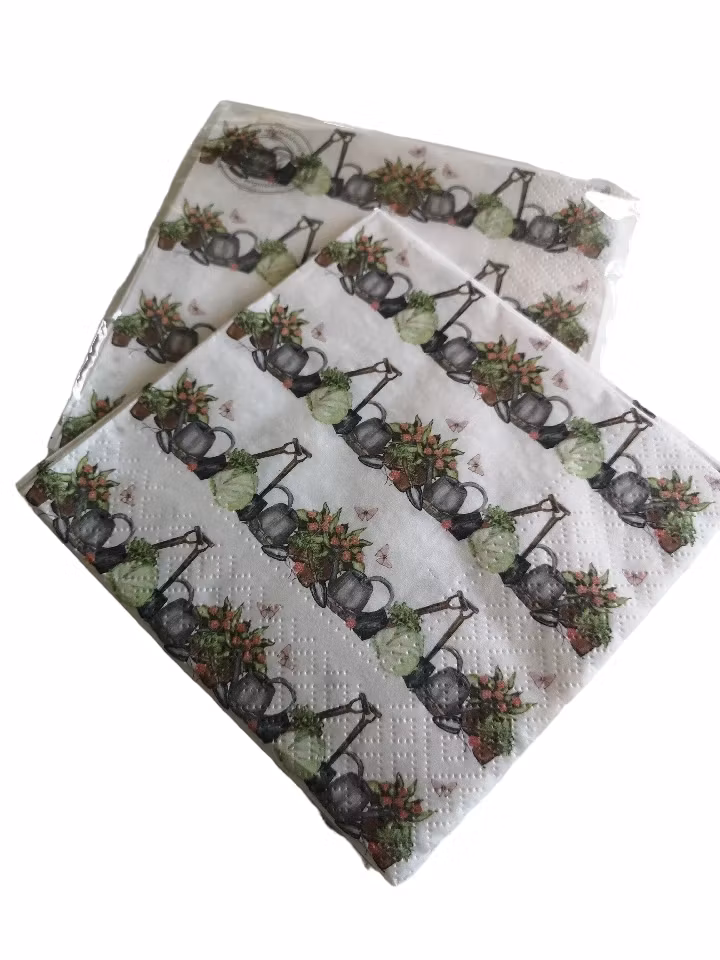 Dessa servetter pryds av vackra illustrationer av vattenkanna, spade och blommor,