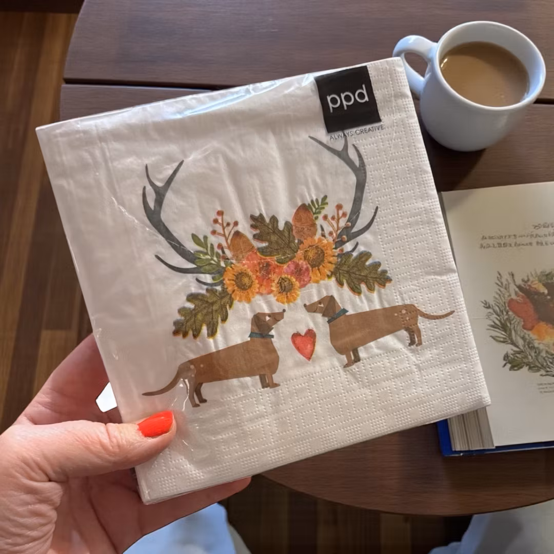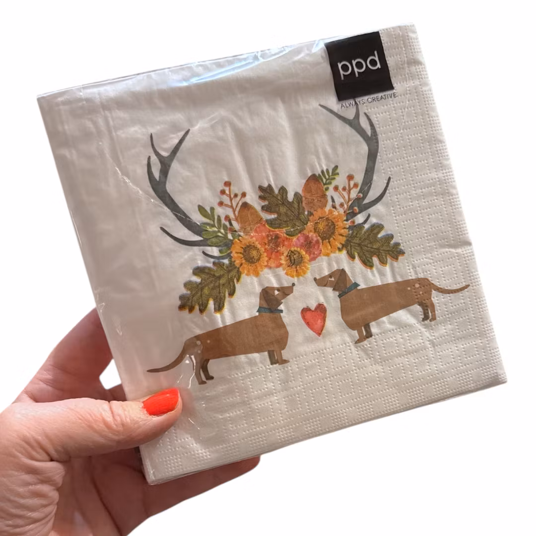 Dessa servetter pryds av ett fint tecknat motiv med två taxar som möts nos mot nos, med ett litet rött hjärta mellan sig som symbol för värme och gemenskap. Ovanför hundarna syns en höstlig sammanställning av renhorn och blommor i mjuka färger som grönt, brunt och gult, vilket ger en naturlig och stämningsfull känsla. Motivet framträder vackert mot den vita botten och gör servetterna till en dekorativ detalj som passar lika bra till höstens middagar som till julens festliga dukningar. Med måtten 33 x 33 cm är de praktiska och lagom stora för både vardag och fest, samtidigt som de tillför en unik och charmig touch till bordet – en liten detalj som sprider både glädje och stämning.
