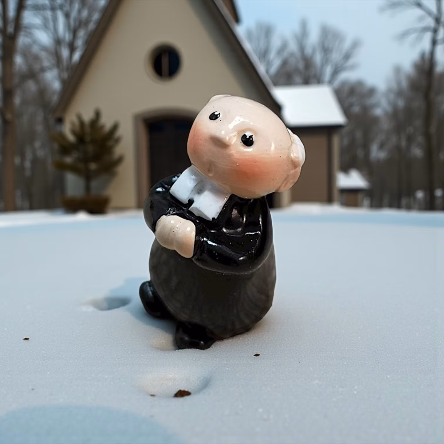 Han bär en svart lång rock, har händerna knäppta på magen och utstrålar lugn och högtid. Figuren är ca 3 cm hög och passar perfekt i storlek till den stora kyrkfamiljen. Formgiven i egen design av Camilla Ståhl, med omsorg om detaljer och en känsla för tradition.