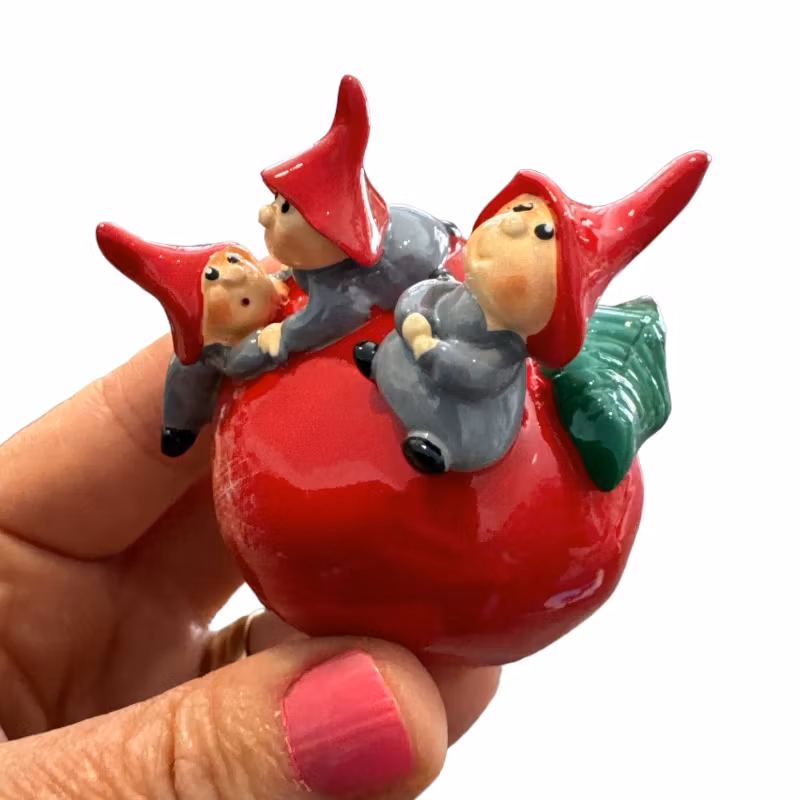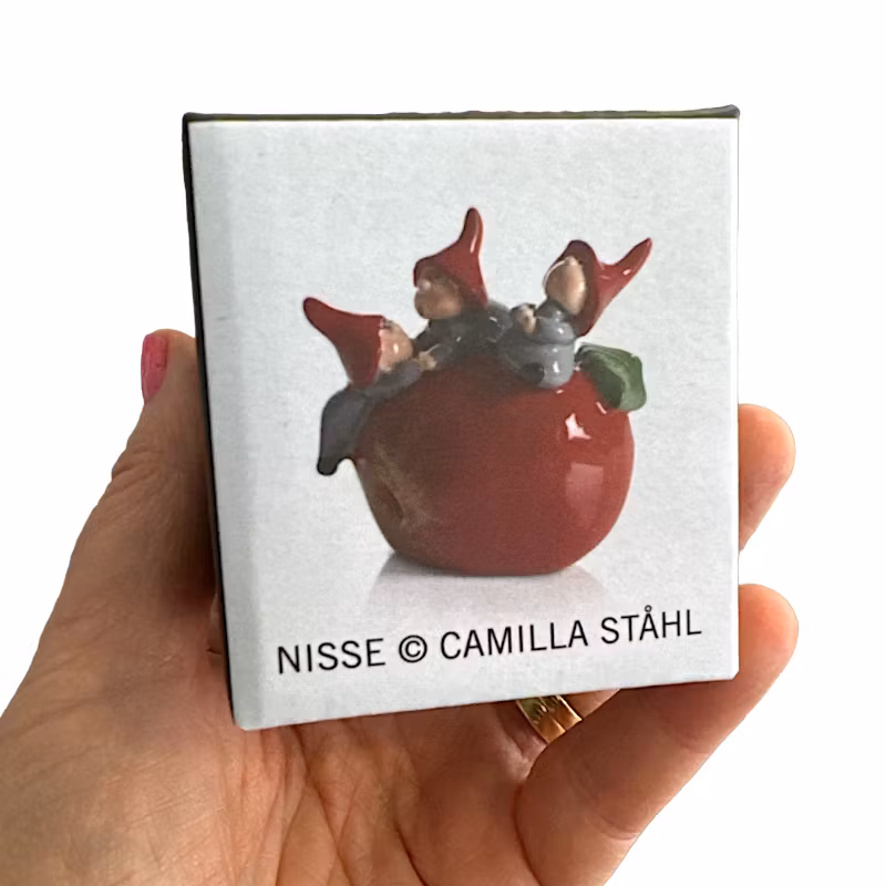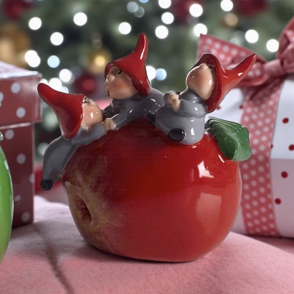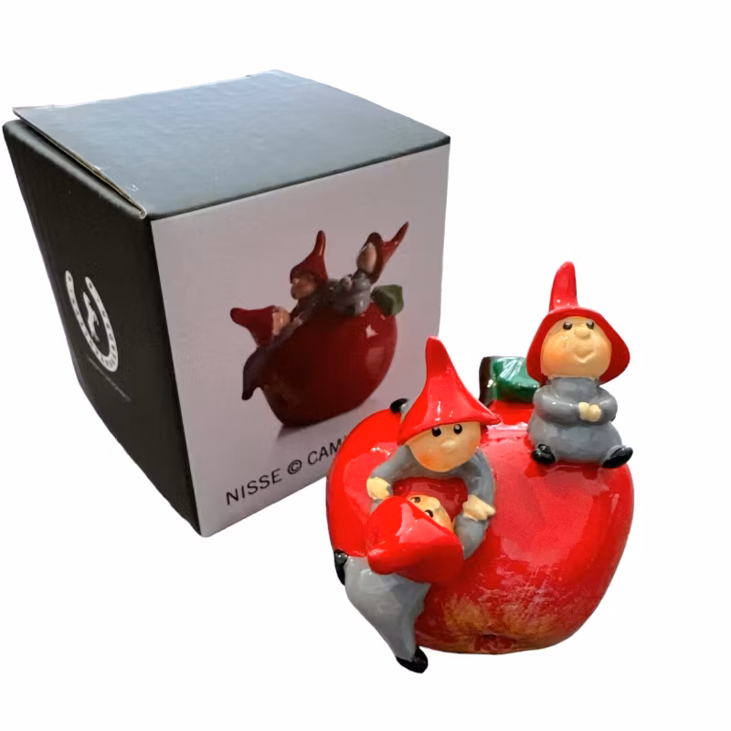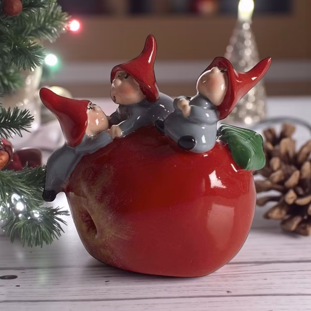 Tre små nissar har hittat ett rött, blankt äpple – och nu är det full fart! De klättrar, balanserar och leker runt frukten med stor entusiasm. En liten och nätt juldekoration som sprider både värme och humor, perfekt att placera i ett stilleben, på hyllan eller som en personlig present.