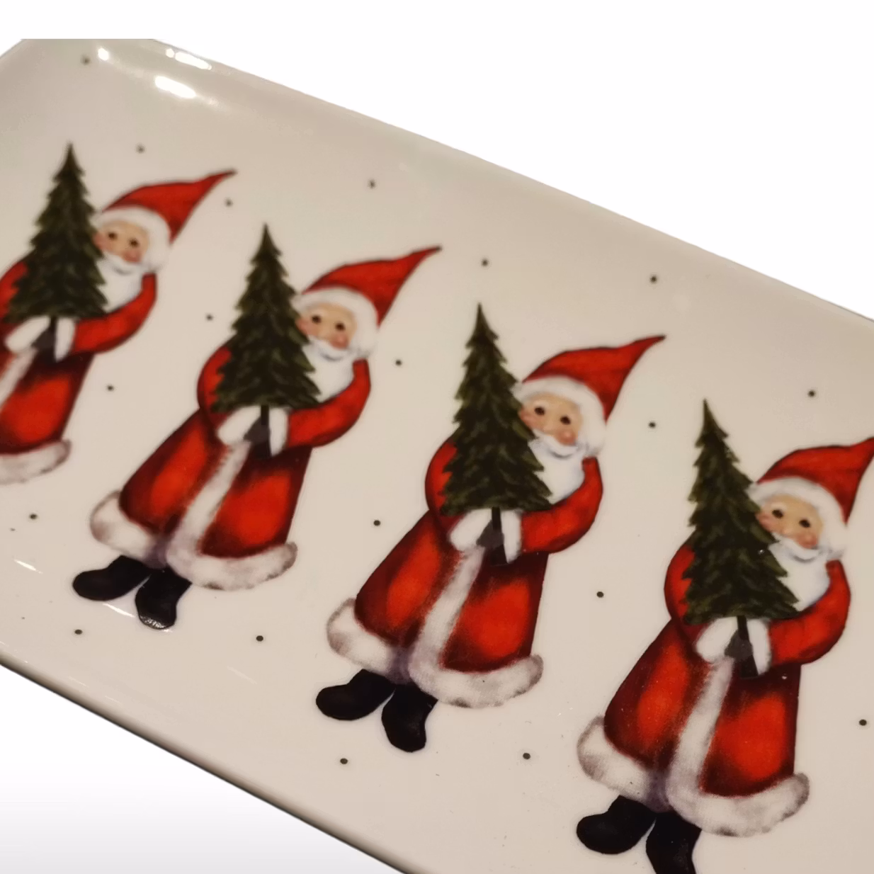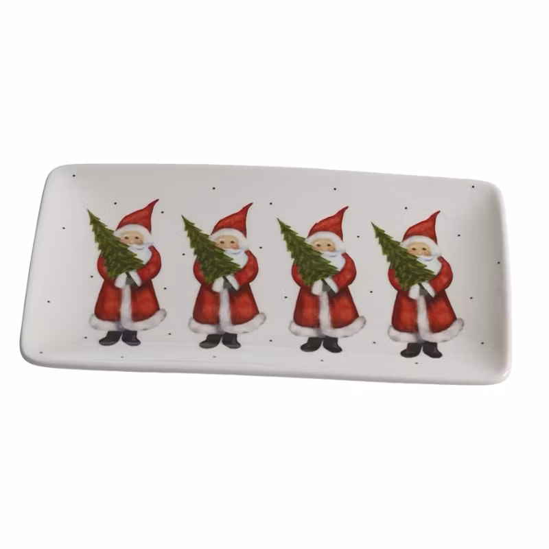 Julefrid – En Avlång Assiett för Julens Goda Stunder. Med ett motiv av fyra tomtar på rad och lekfulla röda prickar sprider denna assiett julens värme.