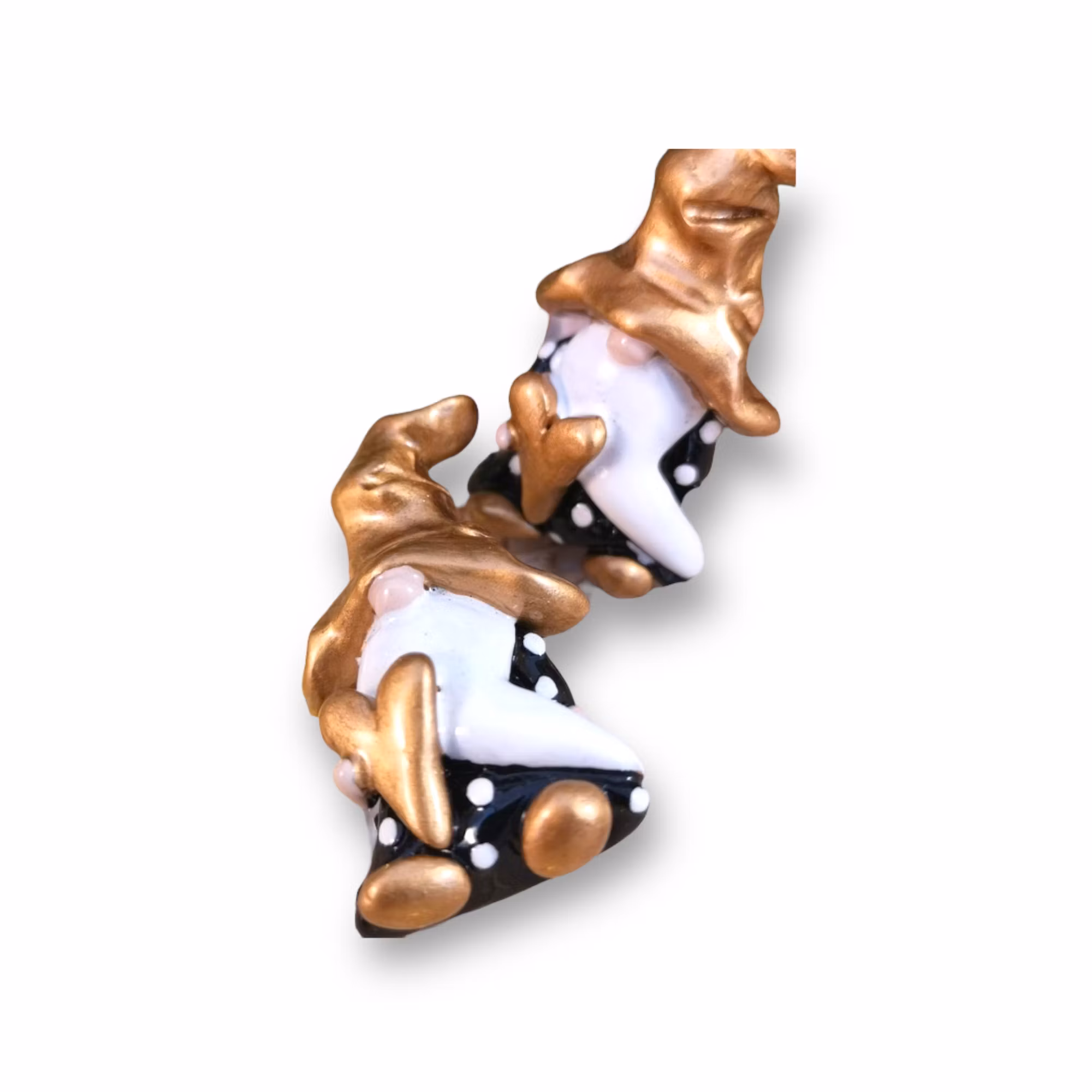 Liten tomte med guldfärgad luva som brosch.EGEN DESIGNStl ca: 4 x 2 cmPris: 45:-